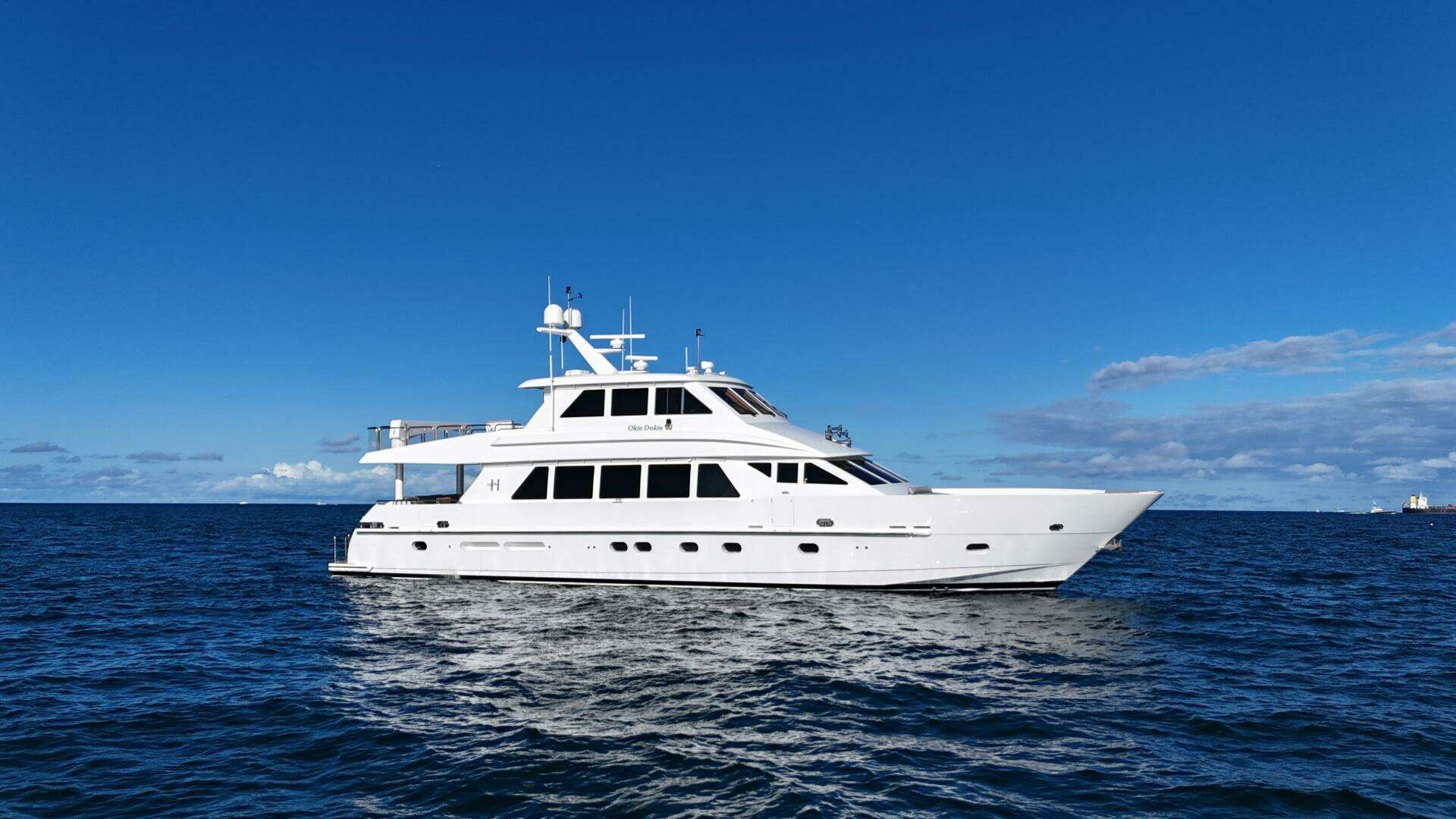 2009 Hargrave 88’ Enclosed Bridge M/Y “OKIE DOKIE” offers an exceptional opportunity to own a like-new yacht at a fraction of replacement cost. Fresh from a 2025 Jarrett Bay full paint and deck refit, with engines rebuilt in 2025, she is truly turnkey. Designed by Yacht Interiors by Shelley, the interior features Gloss Sapeli cabinetry, granite throughout, a spacious main salon, formal dining, and Hargrave’s signature full-beam country-kitchen galley. The enclosed skylounge provides a commanding helm and an ideal entertaining space, while the luxurious master stateroom and well-appointed guest accommodations make her perfect for extended cruising. Equipped with stabilizers, bow and stern thrusters, twin generators, and extensive upgrades throughout, OKIE DOKIE delivers proven Hargrave quality, modern reliability, and outstanding value.