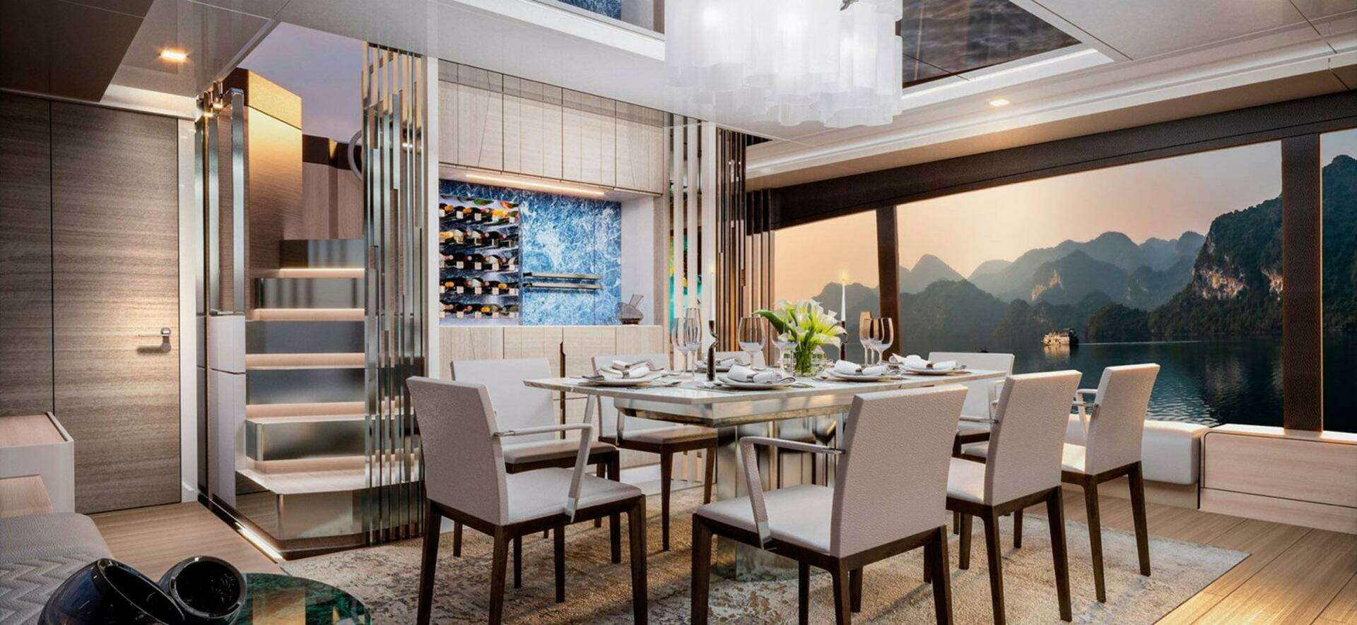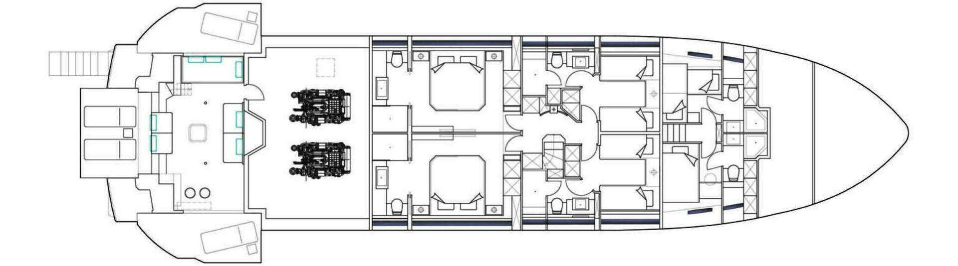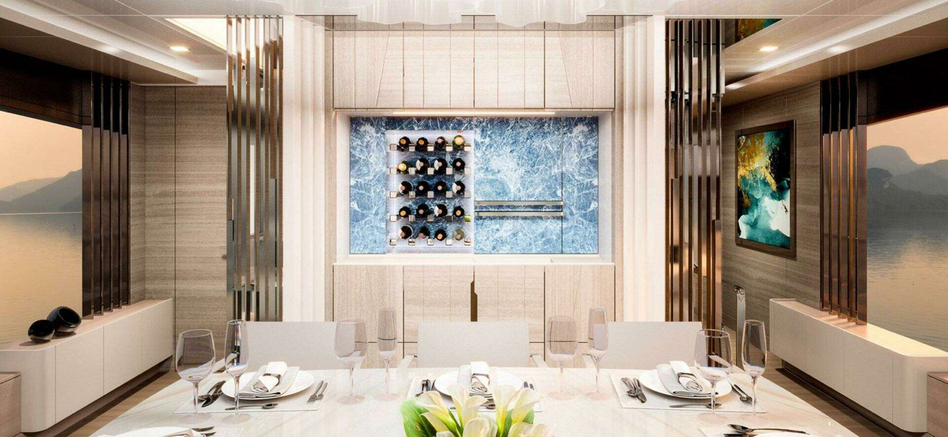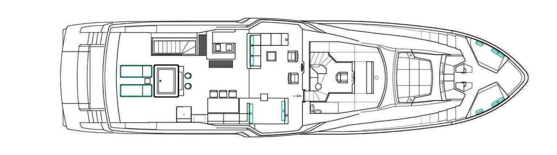 - A 22.5 sqm Foredeck lounge featuring a seating area, infinity sun loungers, and versatile space for yoga, a treadmill, or even a driving range