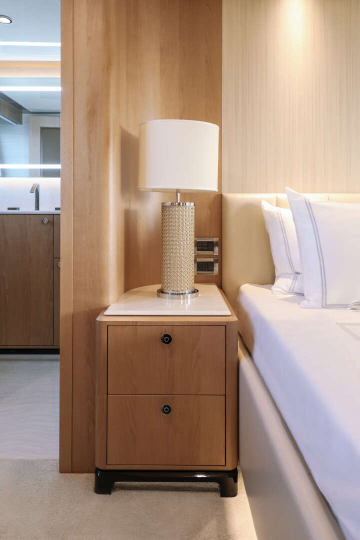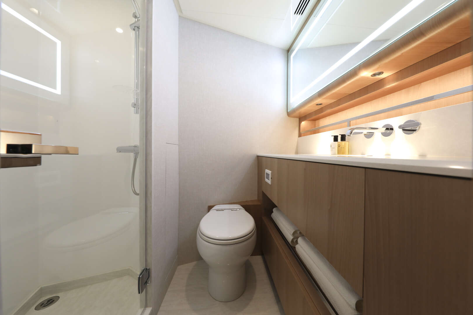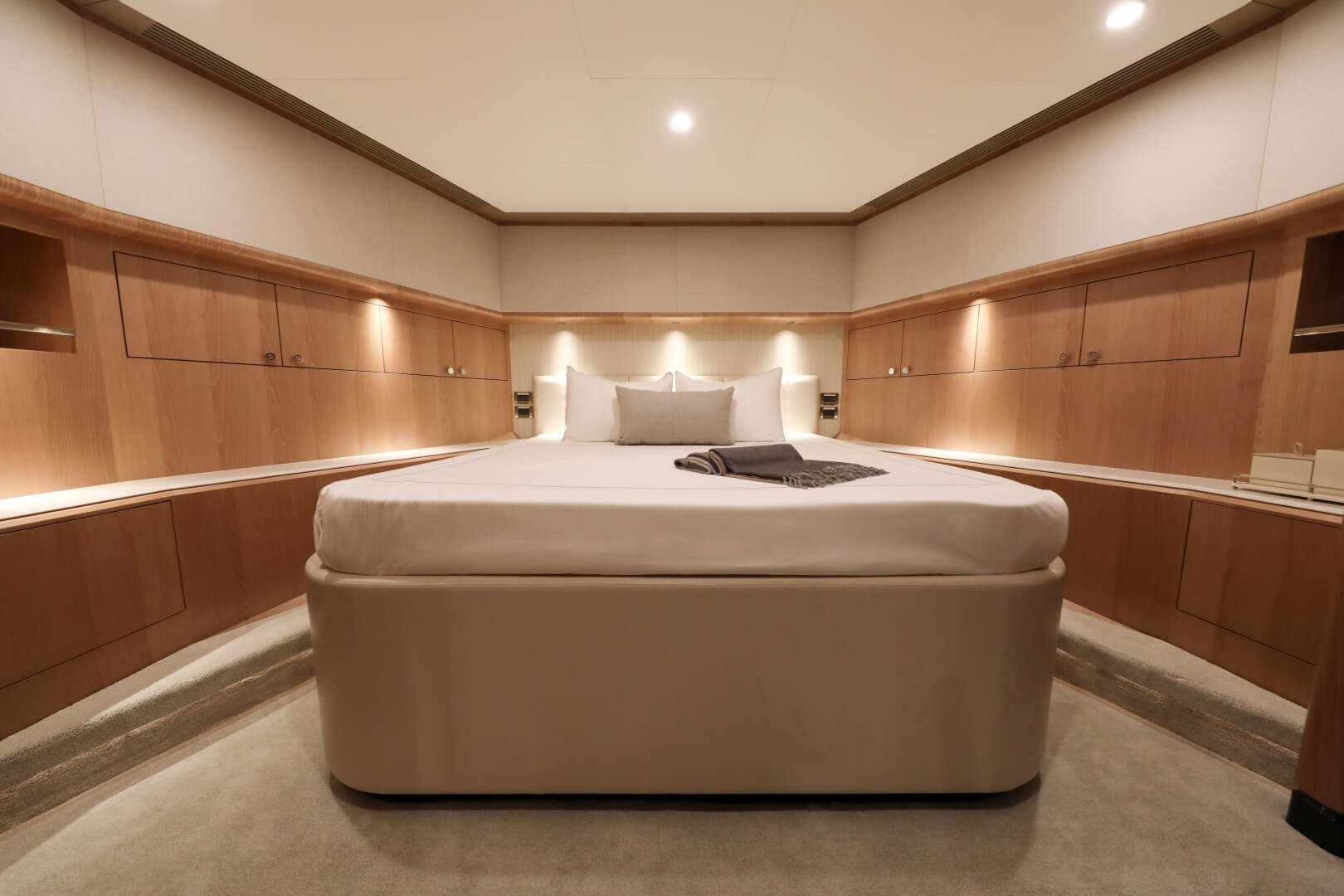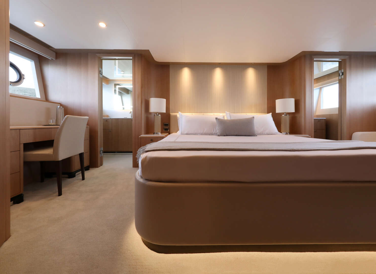 - Perfect Blend of Elegance and Comfort - The lower deck owner's suite is the perfect bland of elegance and comfort. The Owner's suite on the Ocean Alexander 28L is the epitome of luxury and sophistication. The suite is designed with a perfect balance of comfort and style, featuring plush furnishings, high-end finishes, and meticulous attention to detail. A king-sized bed, spacious walk-in closet, and a beautifully appointed en-suite bathroom with his-and-hers canities, a large shower, and luxurious materials create a serene, spa-like atmosphere.