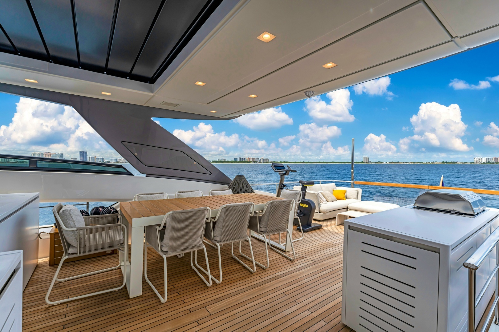 Stepping aboard NOTYNOG through the starboard-side boarding gate, you are welcomed onto the covered main aft deck—an elegantly designed space perfect for relaxation and entertainment. A built-in seating area invites guests to unwind, complemented by two electric up/down tables and five loose chairs for flexible dining arrangements, whether for intimate gatherings or larger social events. Additional boarding access is available via a port-side gate, while a portside pasarelle extends for easy boarding when docked stern-to.