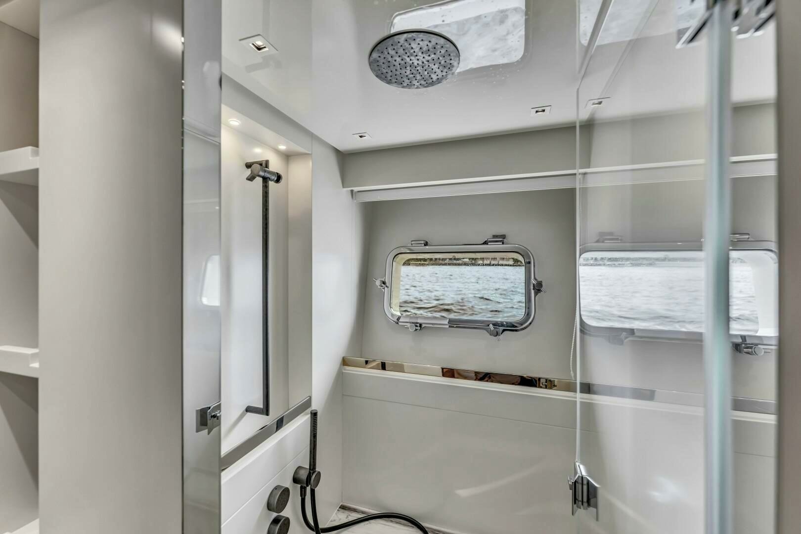 Moving forward on the port side, you pass a striking open-glass staircase leading to the lower cabins. A pocket privacy door separates the main salon from the dayhead and master suite. The full-beam master retreat is designed for ultimate comfort, featuring a king-size bed to starboard, a built-in desk to port, and a hidden television elegantly concealed behind a mirrored panel. Expansive windows on both sides offer breathtaking views, while an electric door provides direct access to the starboard-side main deck. The luxurious en-suite, accessed down a single step to port, boasts dual sinks, a glass-enclosed shower with marble finishes, and a skylight that bathes the space in natural light. Beyond the en-suite, two additional steps lead to an expansive walk-in closet with ample hanging storage.