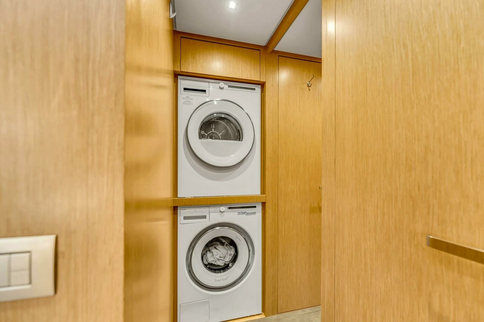 Descending a staircase forward of the galley, the crew quarters are designed for functionality and comfort. Two crew cabins—one to starboard, one to port—are fitted with over/under single berths and portholes, each featuring dedicated en-suite bathrooms with access located just outside the cabins. A stacked washer and dryer are conveniently positioned outside the port crew cabin. Further forward, the crew mess includes built-in seating around a table for four, providing a comfortable space for dining and downtime.