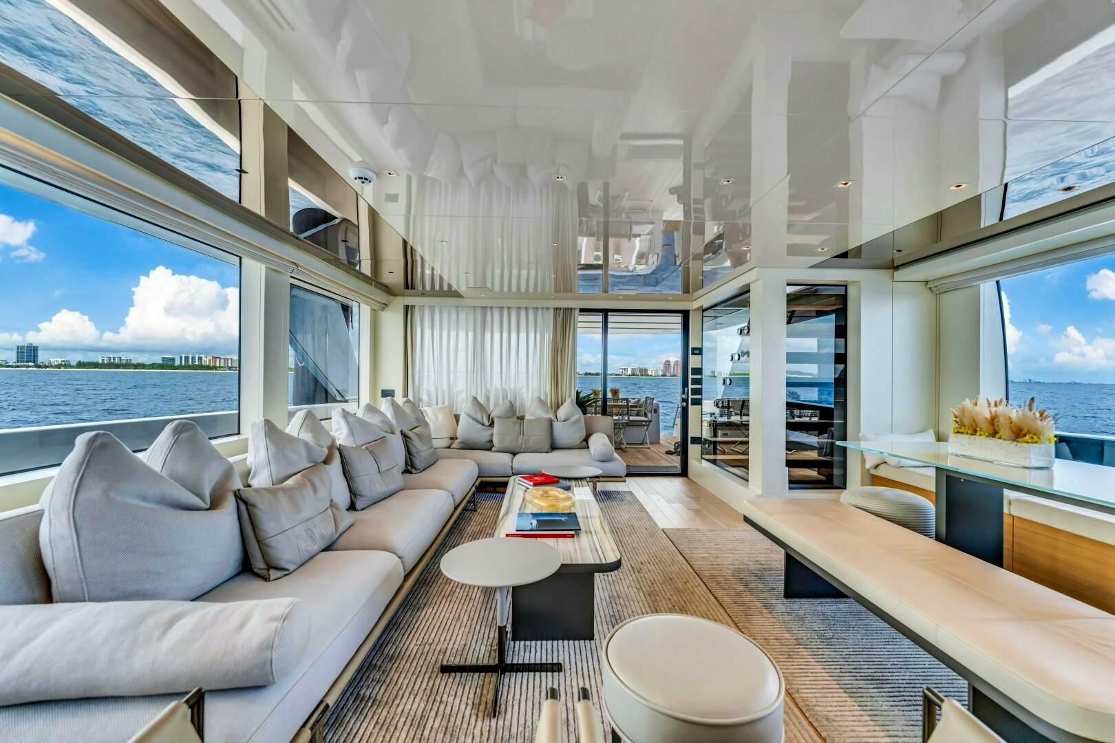 Entering the main salon through the port-side sliding door, you step into a spacious, beautifully appointed interior. A large L-shaped sofa to starboard creates a comfortable lounge area, accompanied by two modern loose chairs and a coffee table. To port, the dining area is positioned to maximize space and natural light. A wall-mounted television is seamlessly integrated behind a mirrored glass panel, while built-in storage along the port side discreetly houses guest amenities. Expansive windows to port, starboard, and aft, flood the space with natural light, enhancing the inviting ambiance.