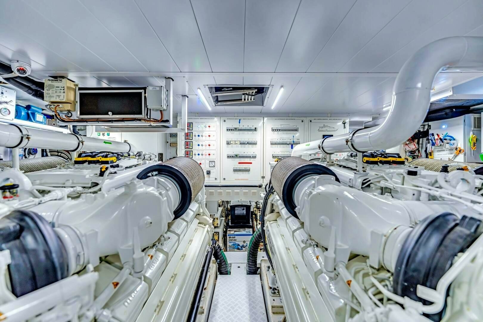NOTYNOG is powered by (2) x 1,973hp MTU 12V 2000 M96L diesel engines, supported by electric zero-speed stabilizers for enhanced comfort while anchored. With a fuel capacity of 9,000 liters (2,378 gallons) and a range of 1,100 nautical miles at 10 knots, she is well-equipped for cruising. Advanced onboard Garmin navigation and communication systems, including Starlink satellite internet, ensure seamless connectivity and ease of operation.