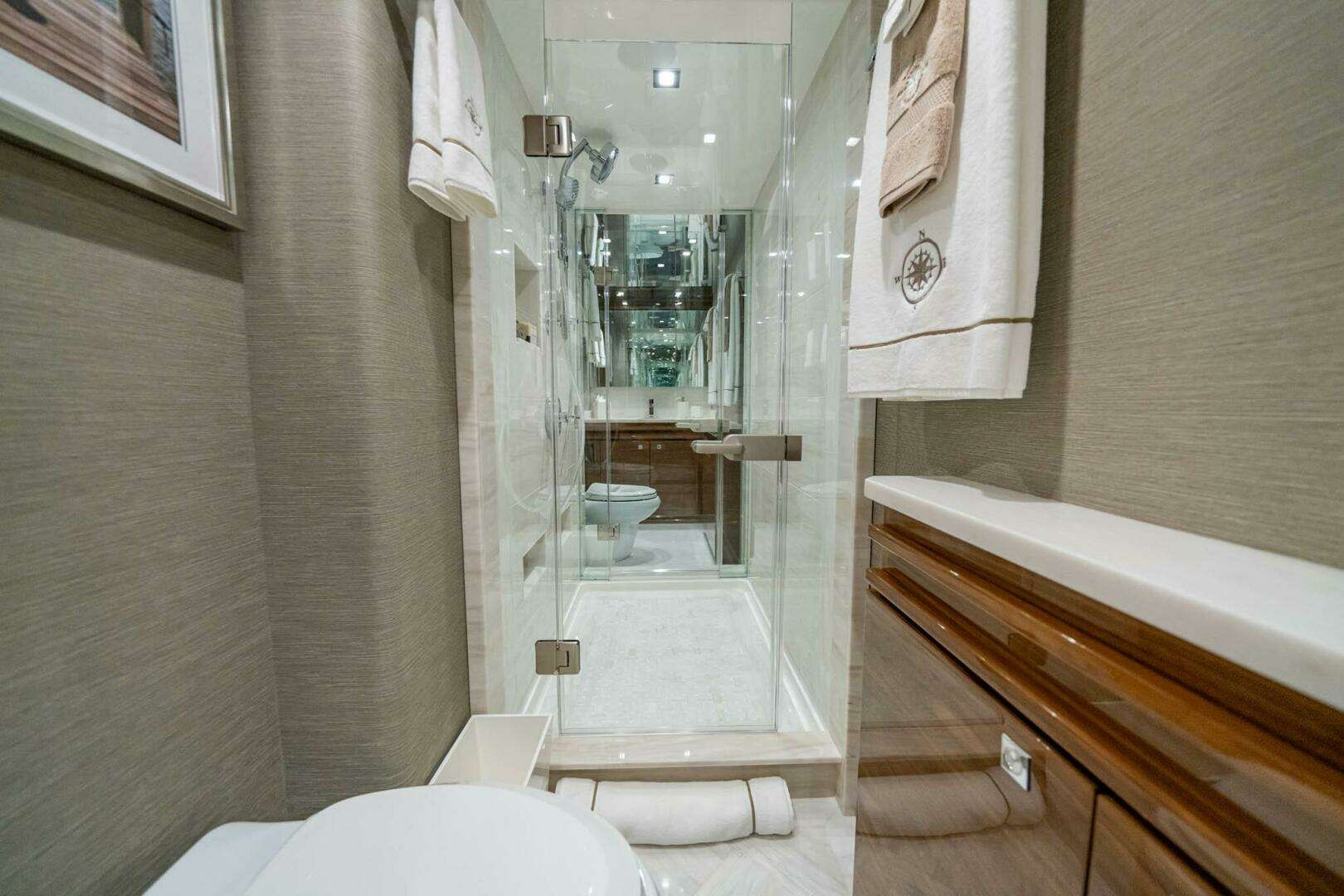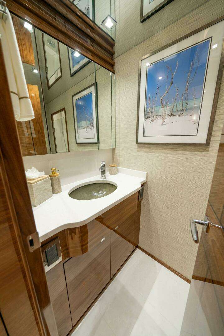 Inside, an open salon flows to a raised dinette and entertainer’s galley with under-counter refrigeration, stone surfaces, and premium appliances. Below, the 90C delivers a six-stateroom / seven-head layout highlighted by a full-beam owner’s suite with king berth and his-and-hers bath; all guest staterooms are ensuite, with dedicated crew quarters and direct engine-room access for true expedition readiness.