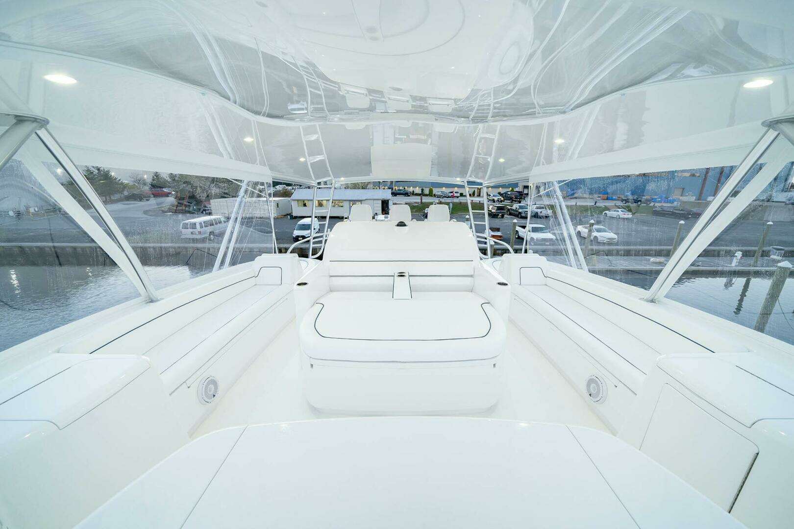 The 224 sq. ft. cockpit is engineered for tournaments: a 203-gal transom fishbox/livewell, twin full-length in-deck insulated fishboxes (refrigeration optional), a reinforced sole for a fighting chair/rocket launcher/table, and centerline Seakeeper 35 access via a single watertight hatch. Dual mezzanines add aft-facing lounges, refrigeration, freezer and service storage—plus an optional drop-down HDTV for dockside downtime.