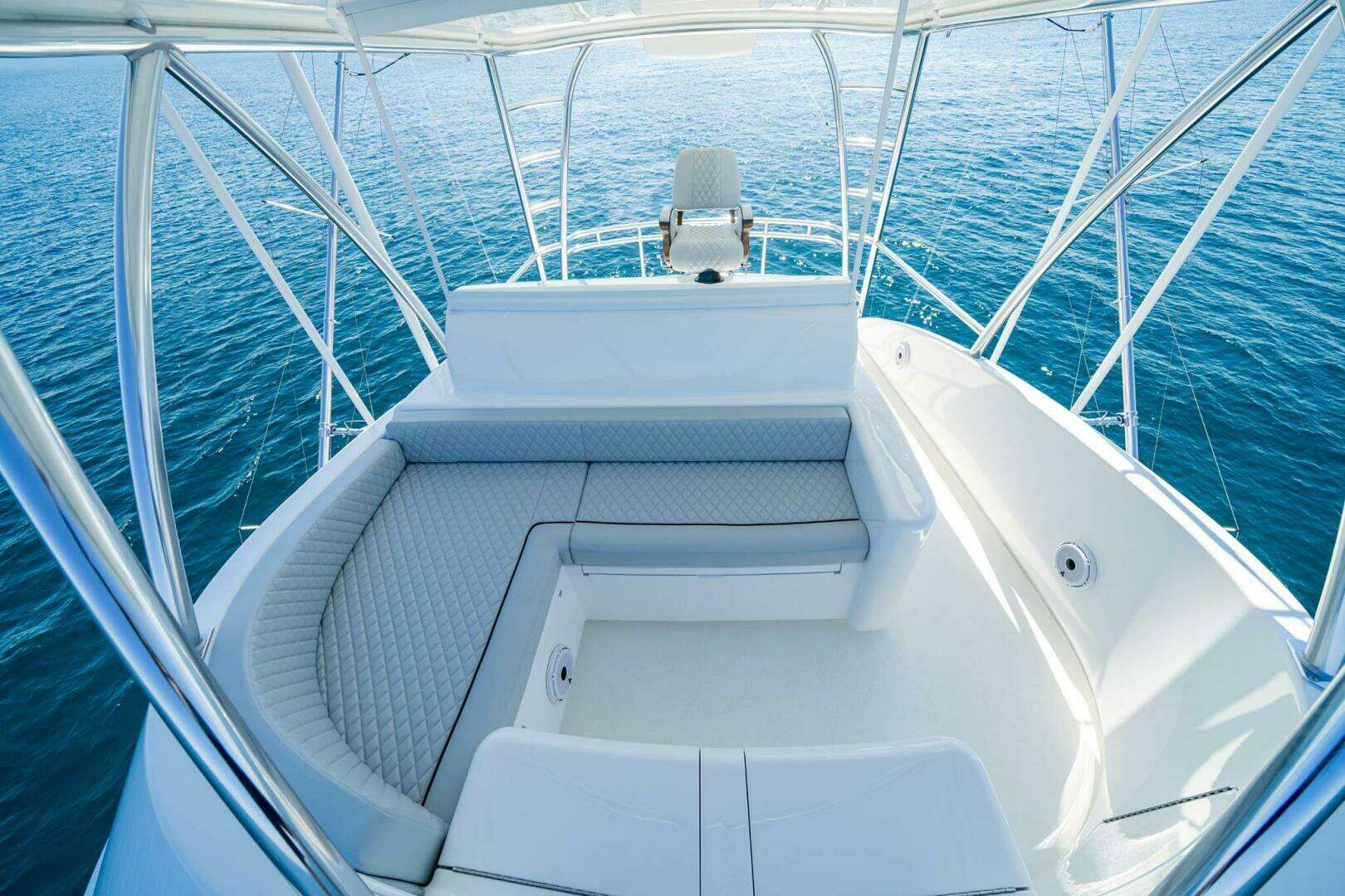 The Sky Bridge configuration offers the best of both worlds- an enclosed, climate-controlled helm with panoramic visibility, plus an open fly helm above for the ultimate command view. The upper helm is equipped with redundant controls, electronics, and integrated seating, ensuring both serious offshore function and relaxed cruising comfort.