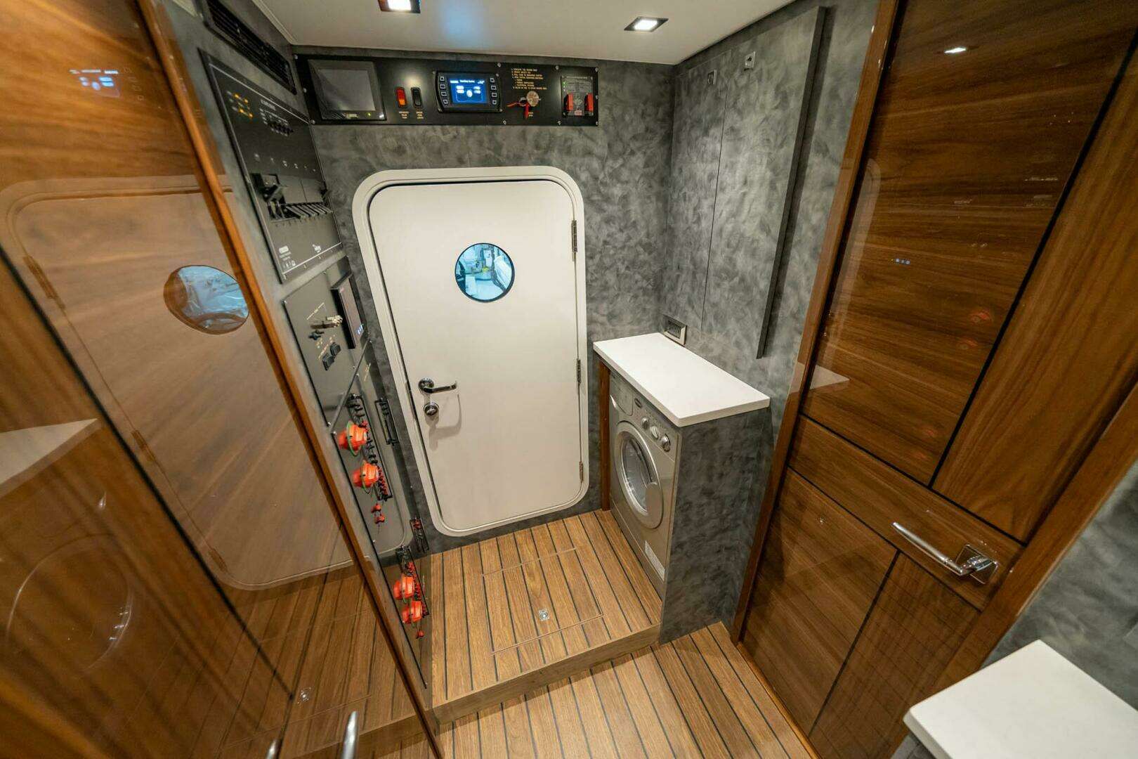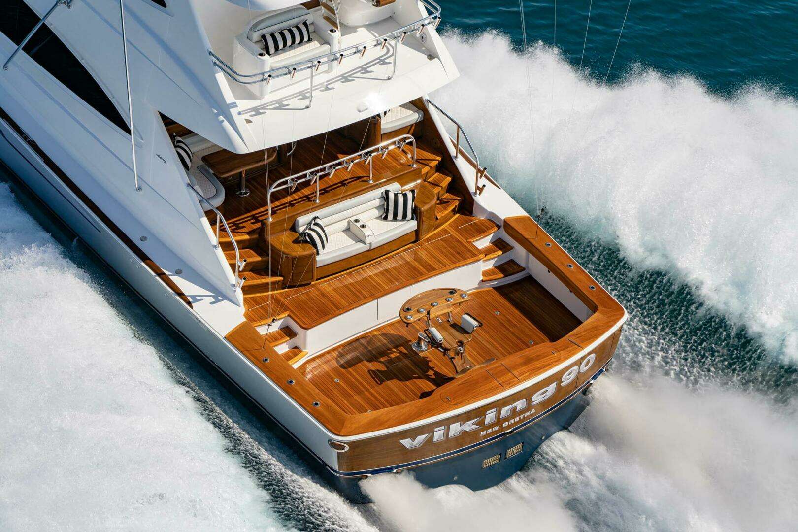 Step inside to a full-beam master suite and four additional staterooms, each with its own en-suite head plus crew quarters with engine-room access. The salon showcases horizontal-grain walnut joinery, stone countertops, and premium finishes that define Viking’s craftsmanship.
