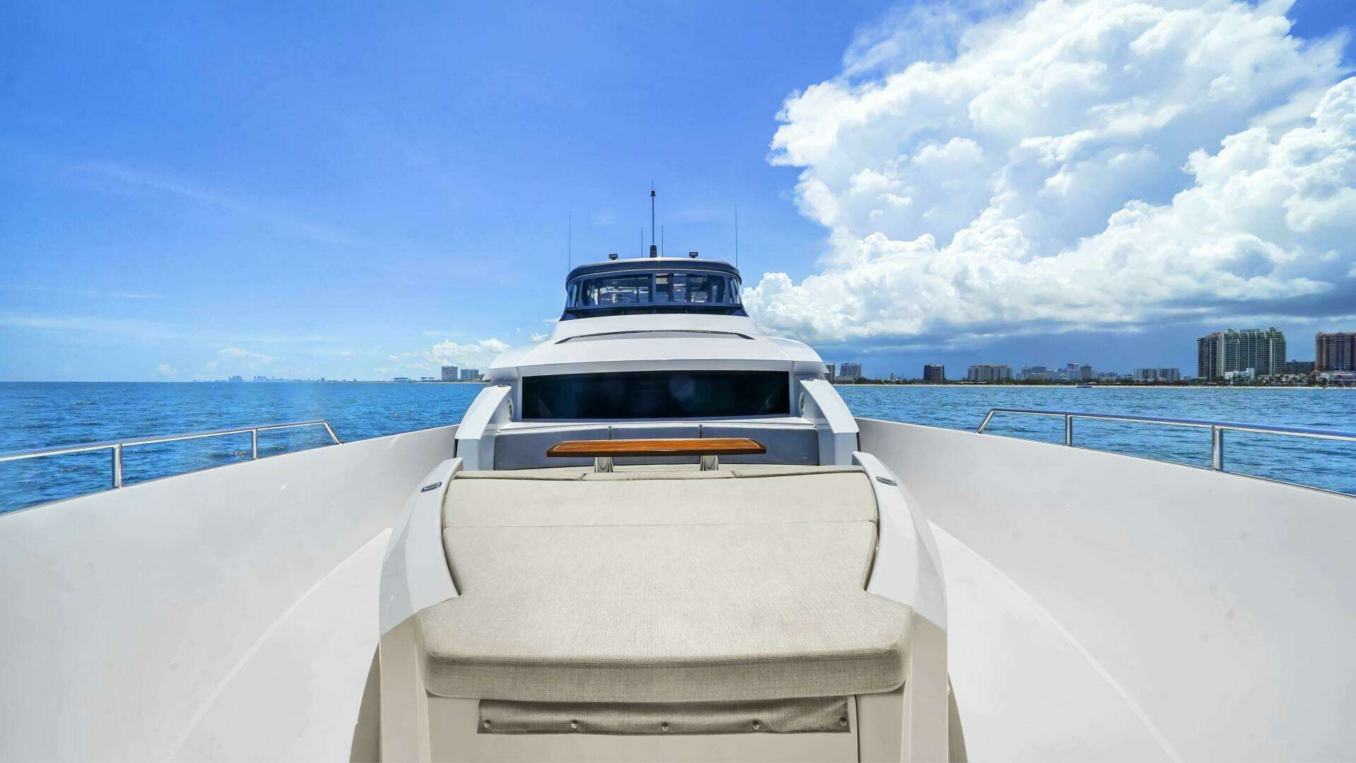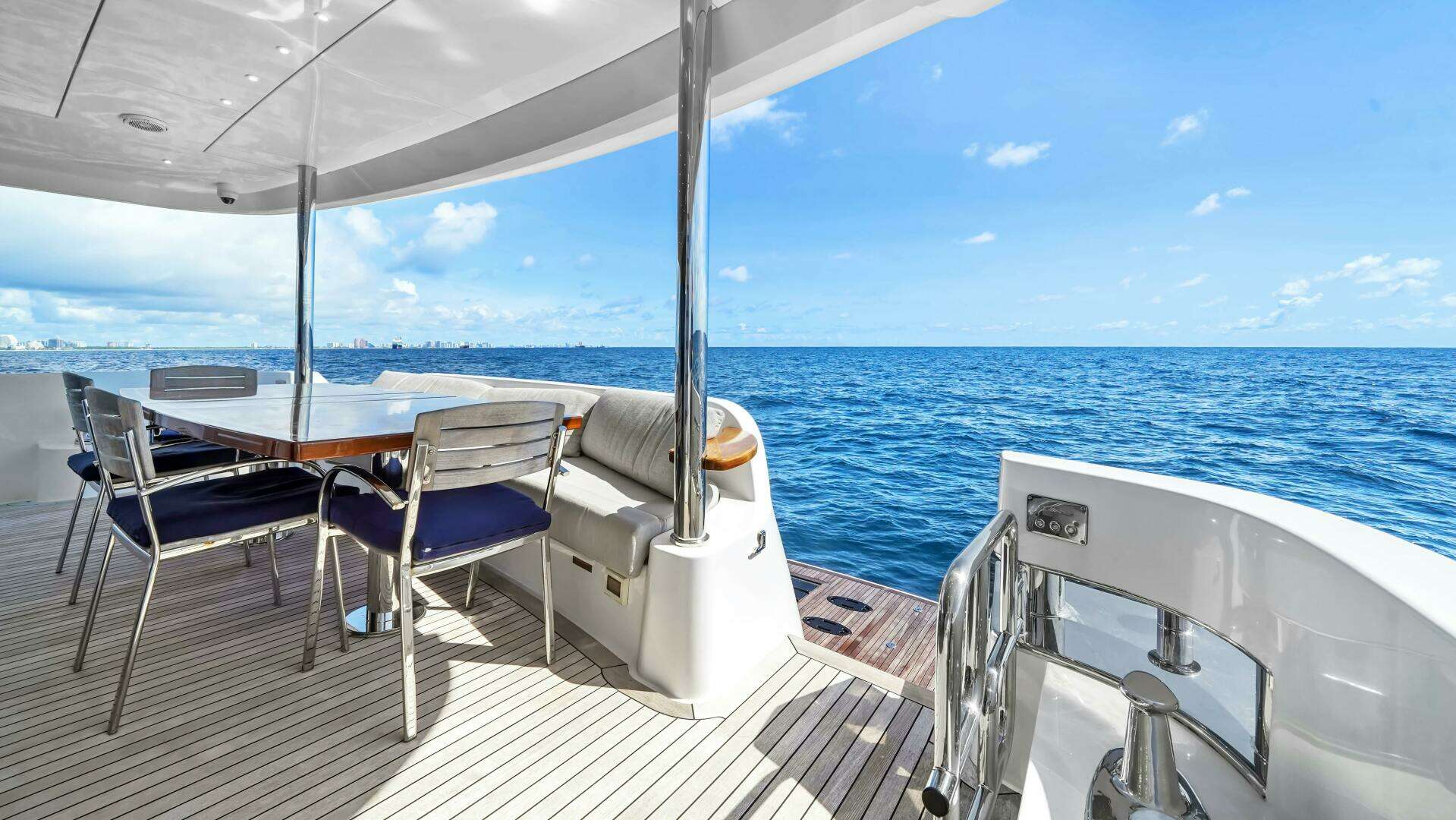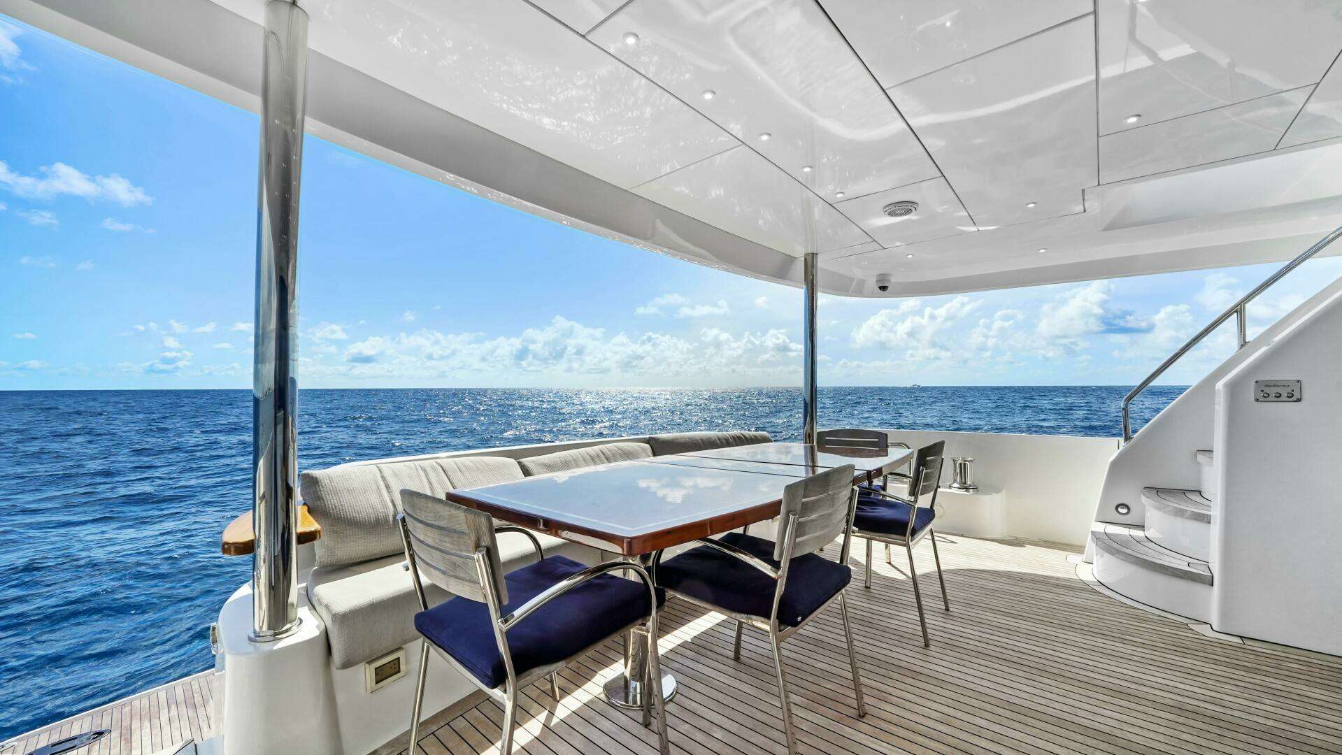 The exterior is designed for entertaining, featuring an aft deck with alfresco dining, a foredeck with a sun pad and recessed dining table and seating, and a spacious and versatile flybridge, open-air and fully enclosed areas, with multiple seating and dining options.