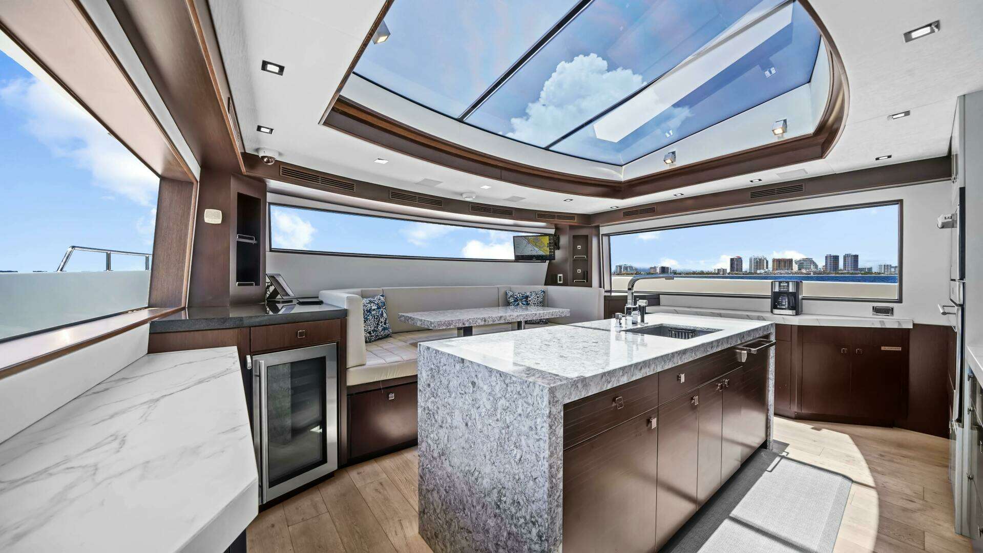 The expansive salon is modern with white-oak sole and light-tone furnishings, a club chair to port, and a large L‐shaped sofa with storage to starboard. Large windows and indirect lighting enhance the salon’s open feeling. Sliding glass doors leading to a foldout balcony to port.Forward of the salon is a formal dining area with a Release Marine table accommodating eight guests, and a buffet cabinet housing fine china, an ice maker, and a drink fridge. Internal stairs facing aft lead to the bridge deck.
