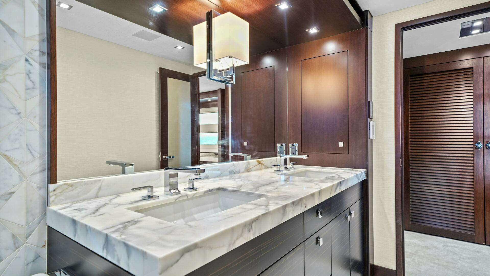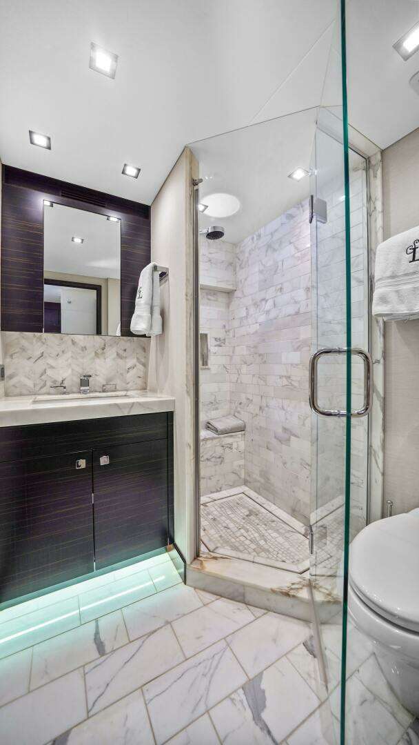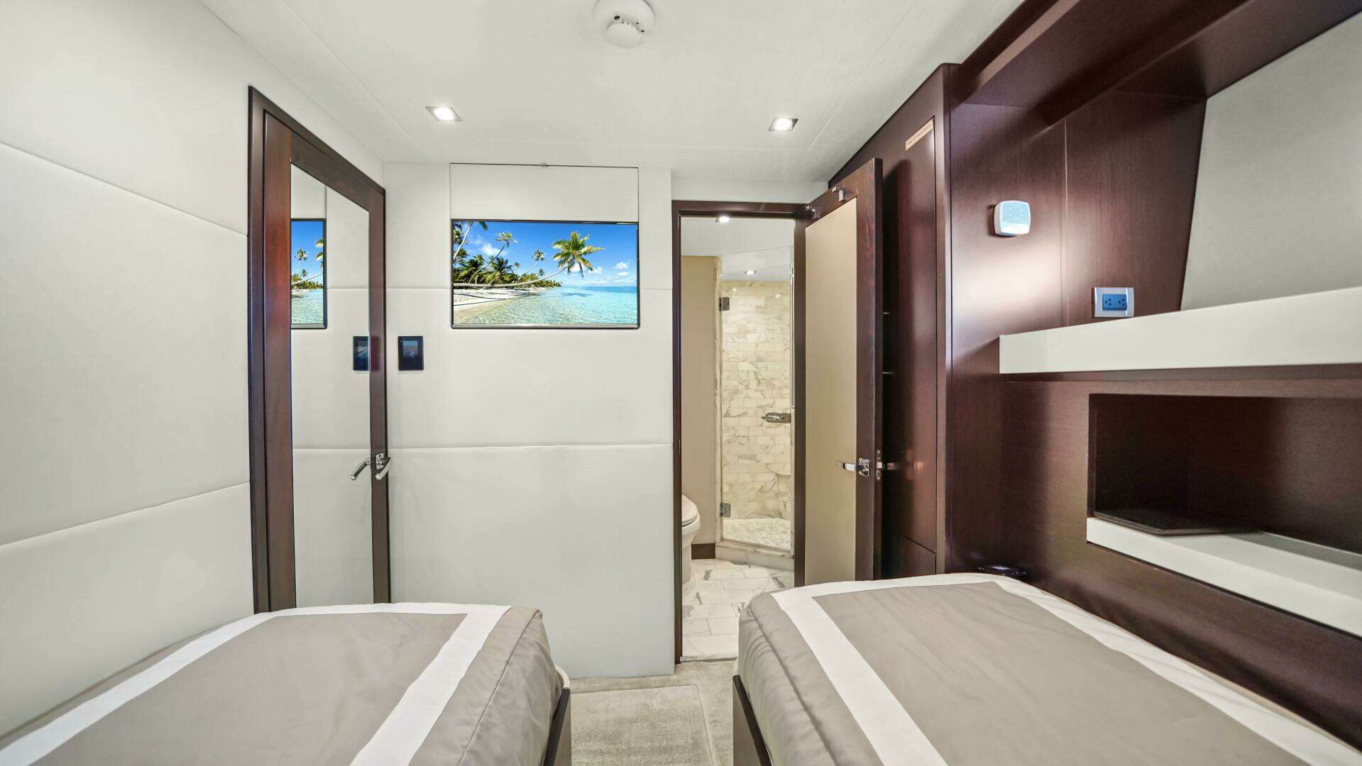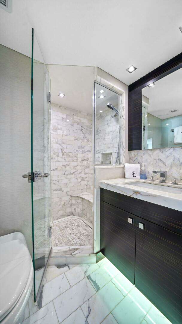 The VIP forward stateroom has a centerline queen berth with an ensuite bathroom featuring heated floors. Blackout shades, electric blinds and Crestron controls keep your guests comfortable.