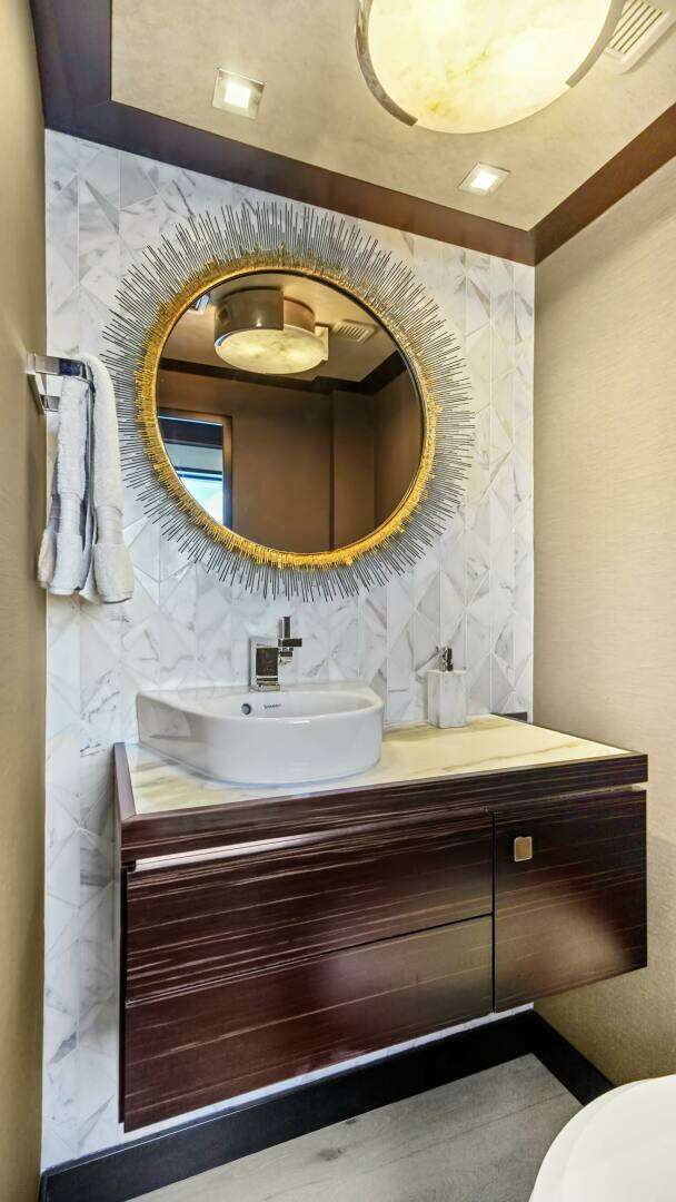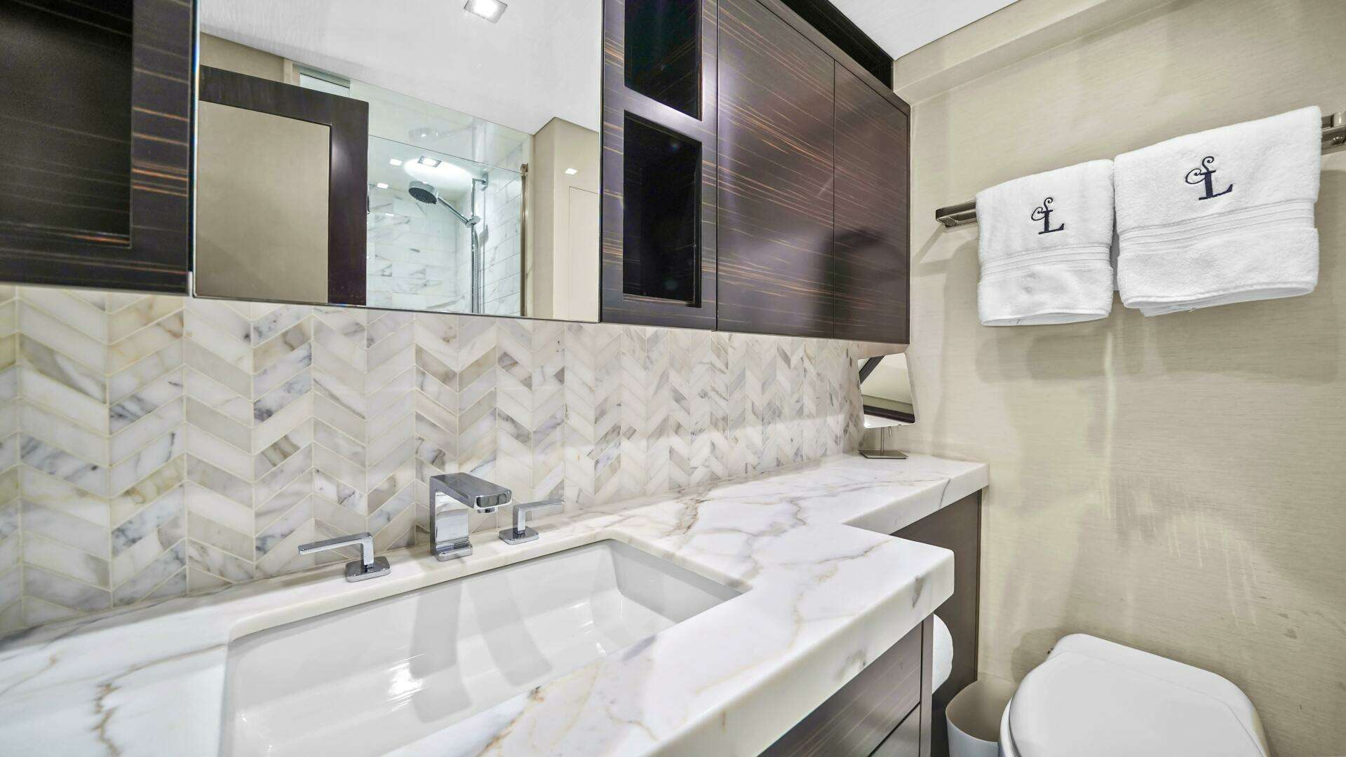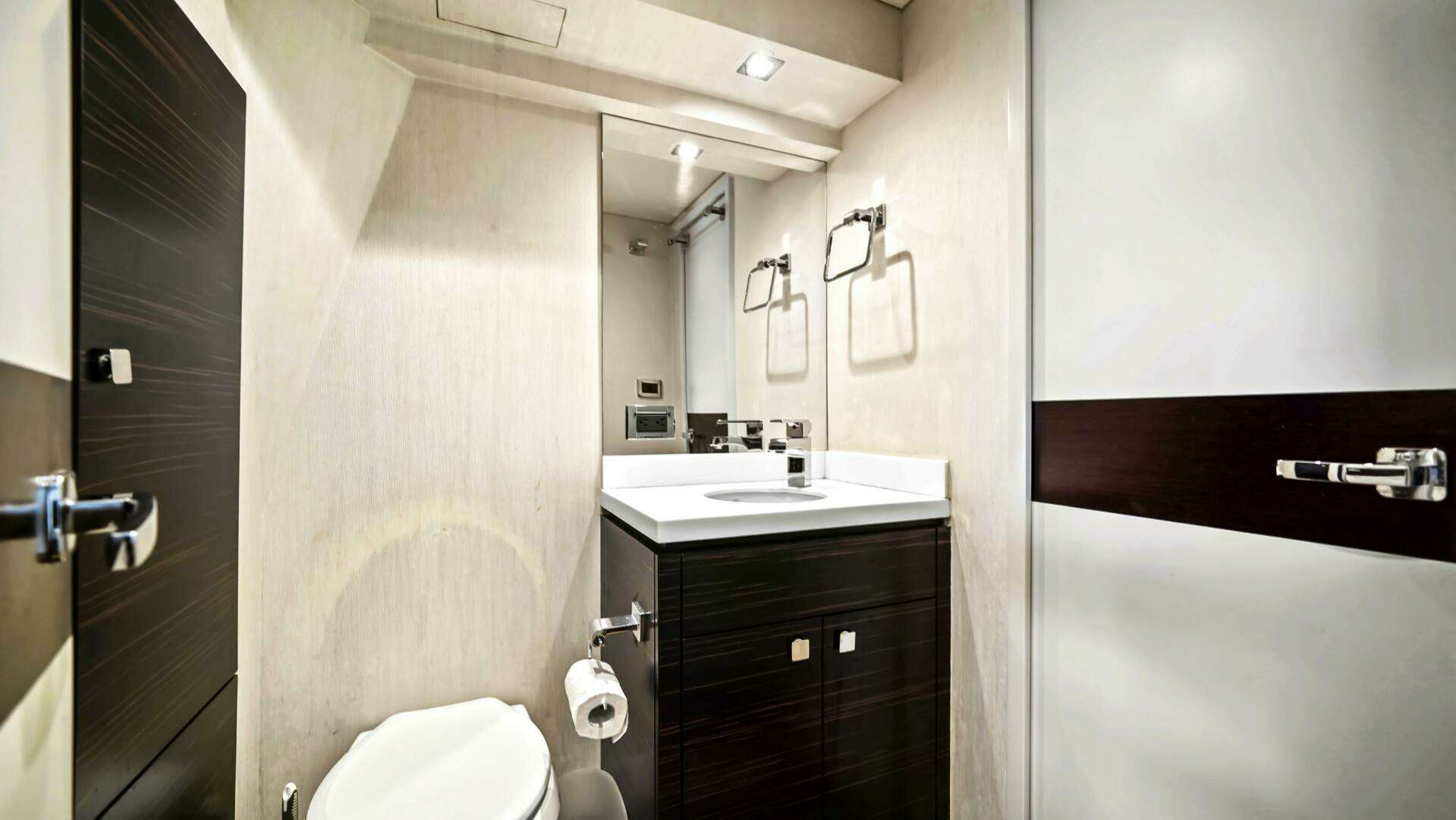 The VIP forward stateroom has a centerline queen berth with an ensuite bathroom featuring heated floors. Blackout shades, electric blinds and Crestron controls keep your guests comfortable.