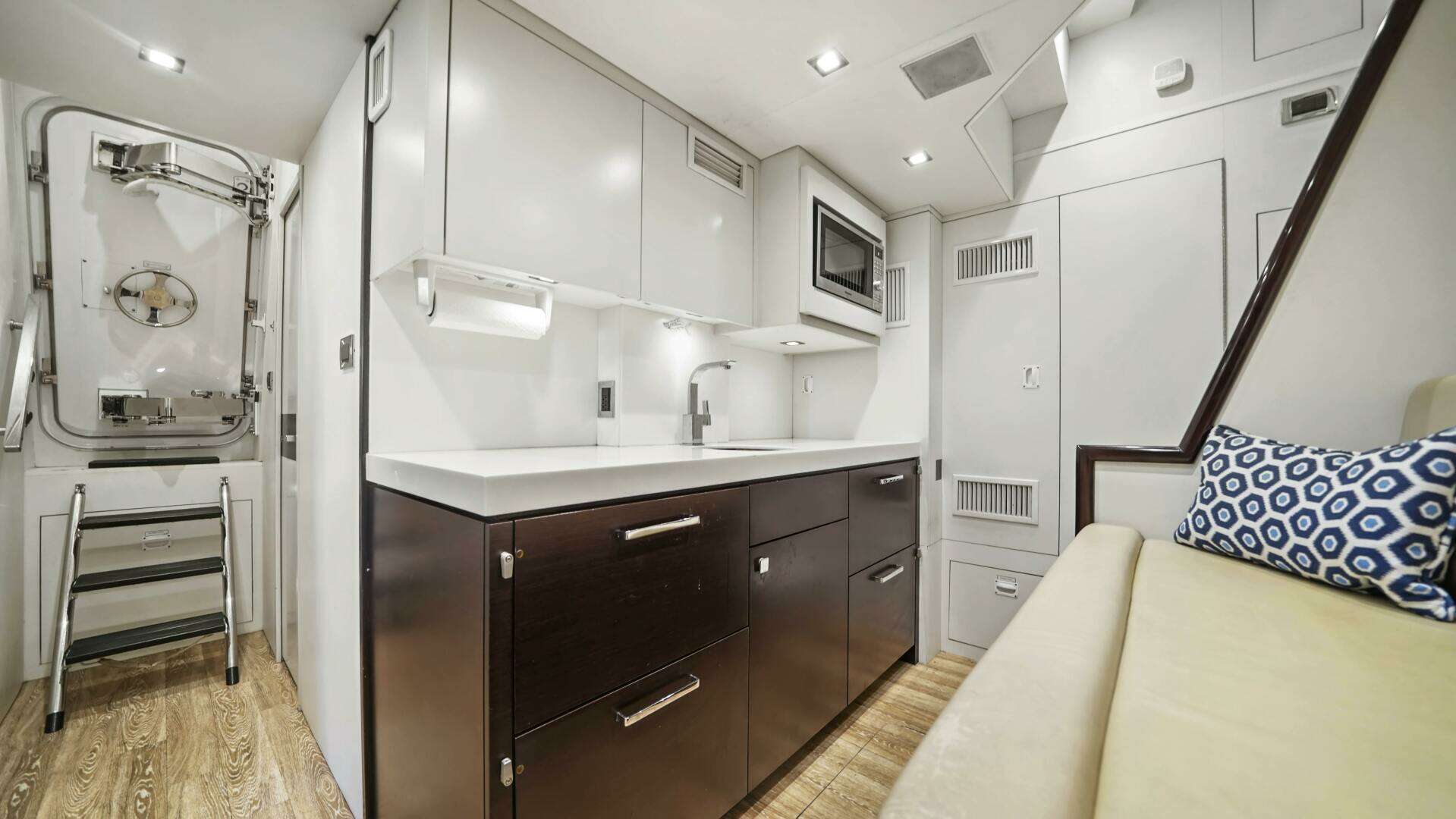 The crew area can be accessed either via a stairway from the aft deck or directly from the swim platform. Inside, there is a comfortable lounge with a settee and a compact galley that features four Sub‐Zero refrigeration drawers, a stainless steel sink, a microwave, and storage cabinets. Beneath the crew sofa, you'll find custom dive tank storage, and the space is plumbed to fill the dive tanks while they remain in their racks. A dedicated closet in the lounge is designed to store wet gear such as life jackets and rain gear, allowing them to dry properly. Accommodations for up to four crew members include a starboard cabin with a queen‐size bed and a portside cabin with bunks. Both cabins share a head and shower, providing a comfortable living space for the crew.- Custom crew arrangement with modified crew lounge and crew portlight