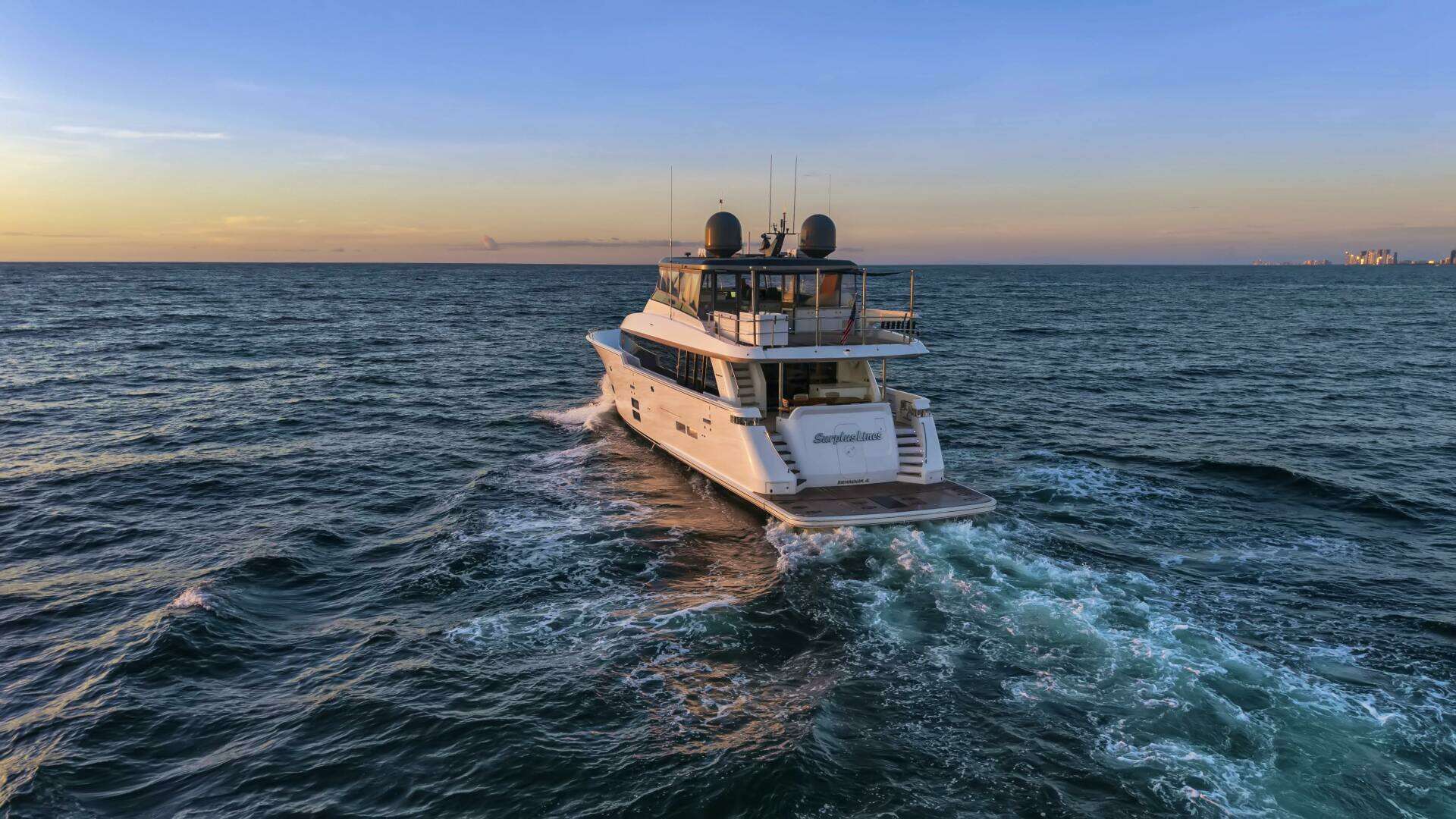 The Hatteras M90 Panacera "SURPPLUS LINES," delivered in 2019, is a custom-built motor yacht designed for a large family, boasting over $2 million in custom features. Powered by Caterpillar C32A 1900hp engines (2200 hours) with a CAT360 joystick control system, ensuring performance and comfortable cruising.The yacht's interior includes a modern salon with sliding glass doors leading to a foldout balcony to port, formal dining area, and a country galley, all with elegant furnishings and ample space. Below deck, 10 guests are accommodated in 4 guest staterooms, all en-suite, including a full-beam master stateroom, a VIP stateroom, and two convertible guest staterooms each with three twin berths.