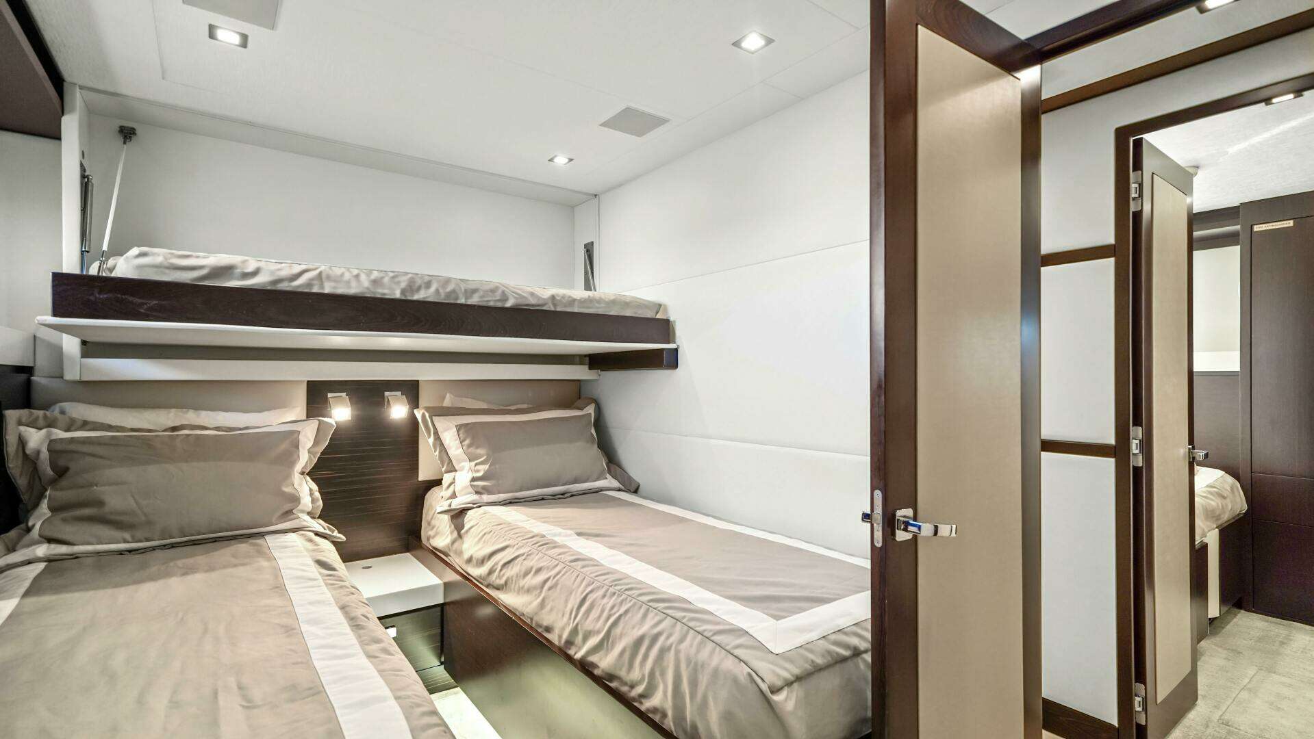 The starboard stateroom offers versatile sleeping options, with three twin beds that can be reconfigured into a queen by sliding the two lower bunks together. This cabin also includes an ensuite head and shower, featuring heated floors for extra comfort. The cabin's audiovisual systems are managed through Crestron iPad controls, providing a high‐tech, intuitive experience.