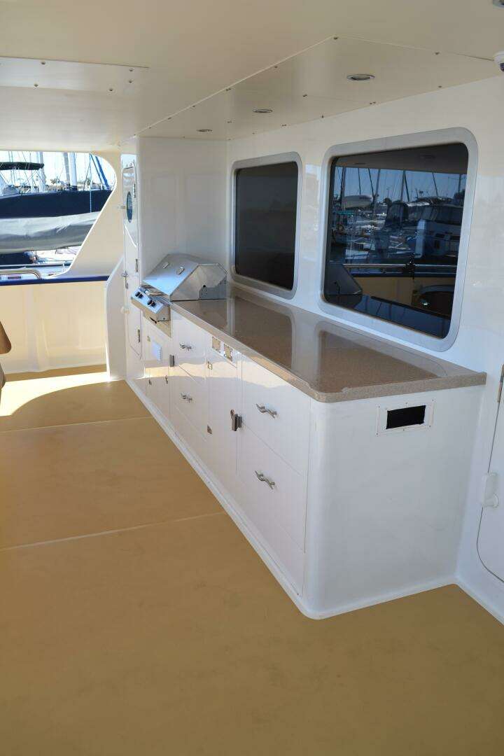 Aft Deck is located aft of salon on level 2, with oval dining table for 8 persons, complete with electric BBQ and Sub Zero under counter refrigerator and freezer drawers (2) each.