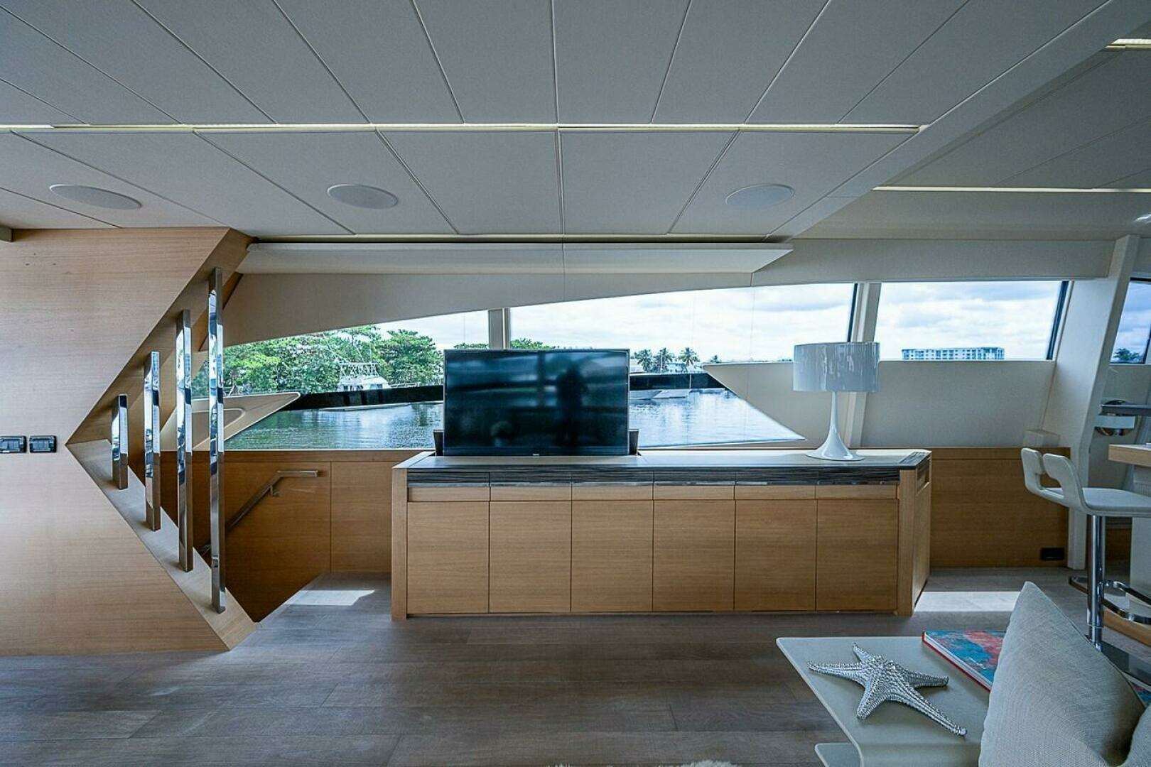 Forward of the salon lies the helm station, outfitted with state-of-the-art navigation and control systems. Large windows provide excellent visibility and natural light, enhanced by recently added tint and V-Cool film. Electrically actuated doors on both the port and starboard sides facilitate ideal communication between the Captain and Mate and provide easy access to the bow.