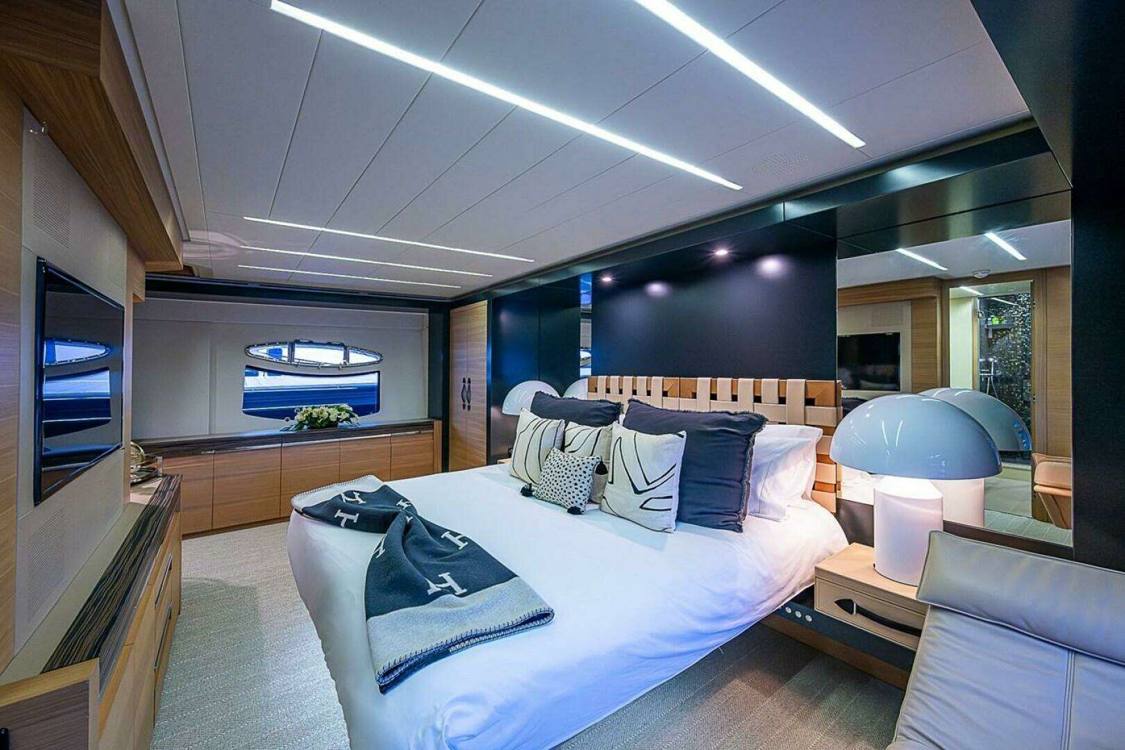 Descending a central staircase from the main saloon, you’ll discover the full-beam master suite. This luxurious retreat features a king-size bed, a cozy seating area, ample storage, large windows, and an en-suite head and shower adorned with high-end finishes.