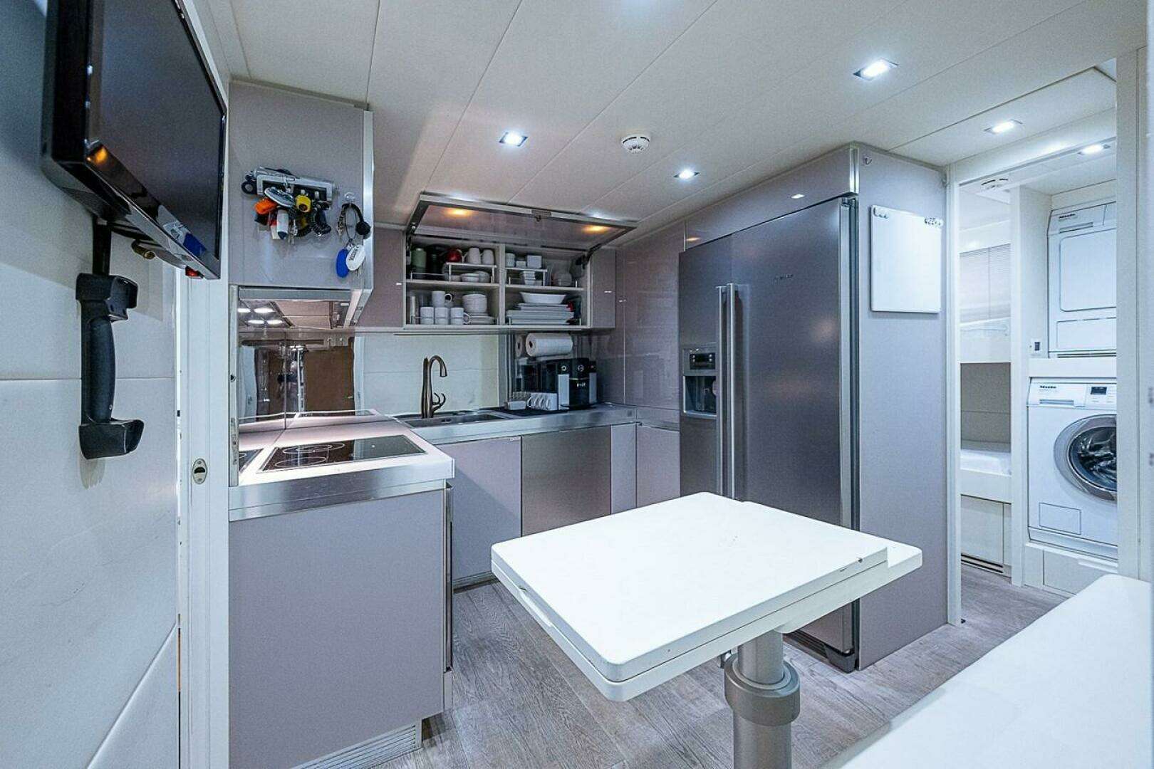 salon. The well-equipped galley includes an oven, range, and large refrigerators and freezers.