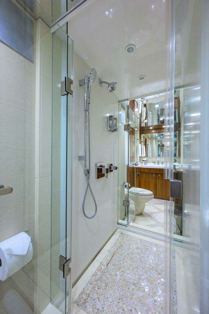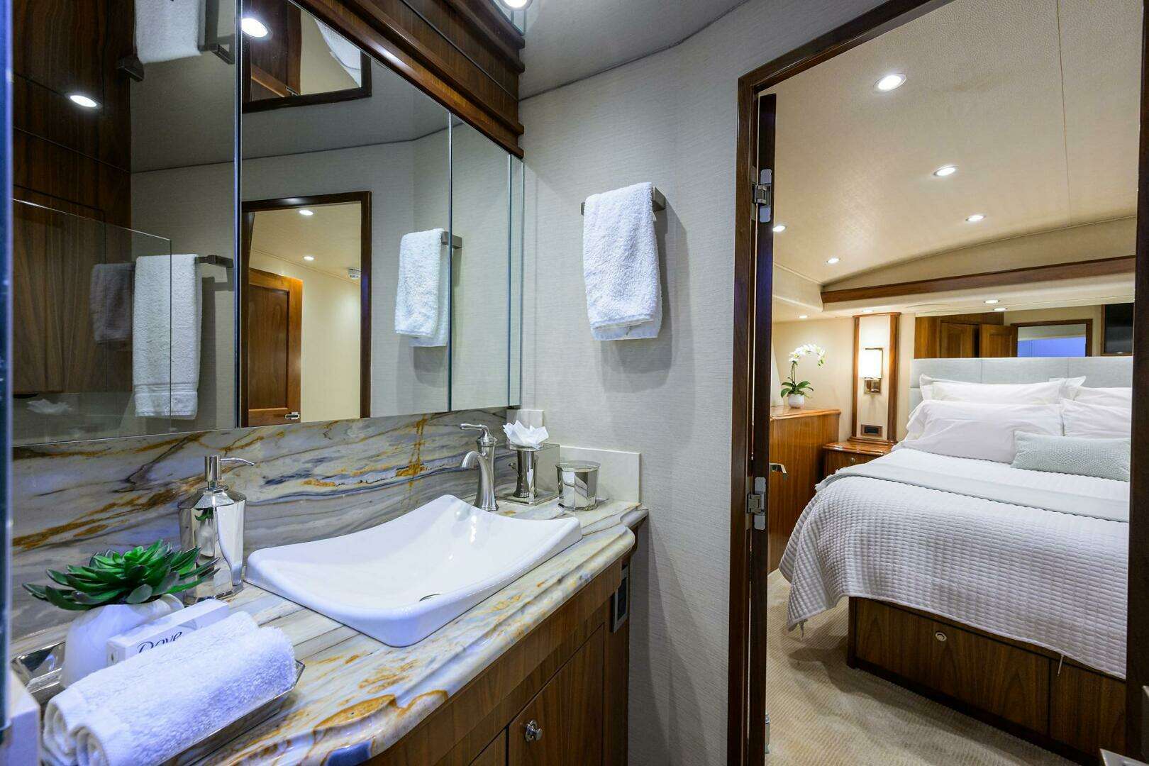 The beautiful lines and sleek look make the "Speculator" turn heads wherever she ties up. Take advantage of having the amenities of both a Sport Fish and Motor Yacht. Watch your spread on the rear facing lower mezzanine or entertain on the salon main deck, equipped with full table and plenty of seating. The Main Deck also offers a drop-down TV and dual grills and prep area. Attention to detail was not overlooked with this vessel. With numerous Upgrades and Custom work, "Speculator" is one of the most beautiful vessels on the water. Hand-picked upholstery and stone from an experienced interior decorator makes this vessel one of a kind.
