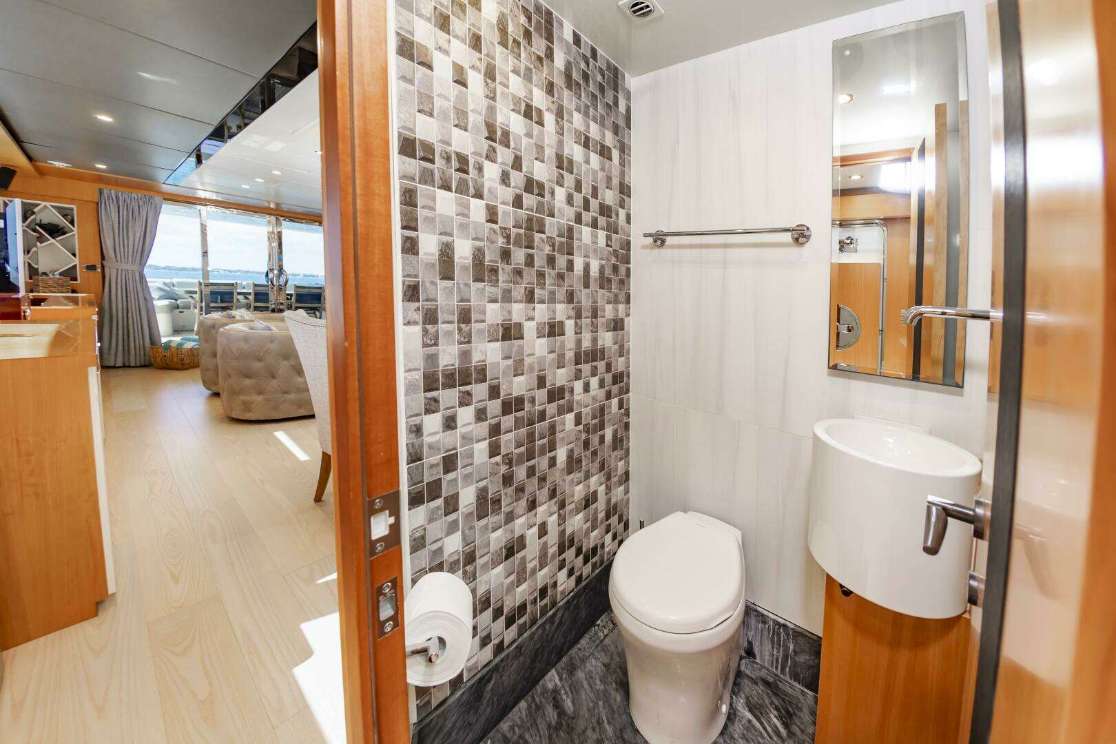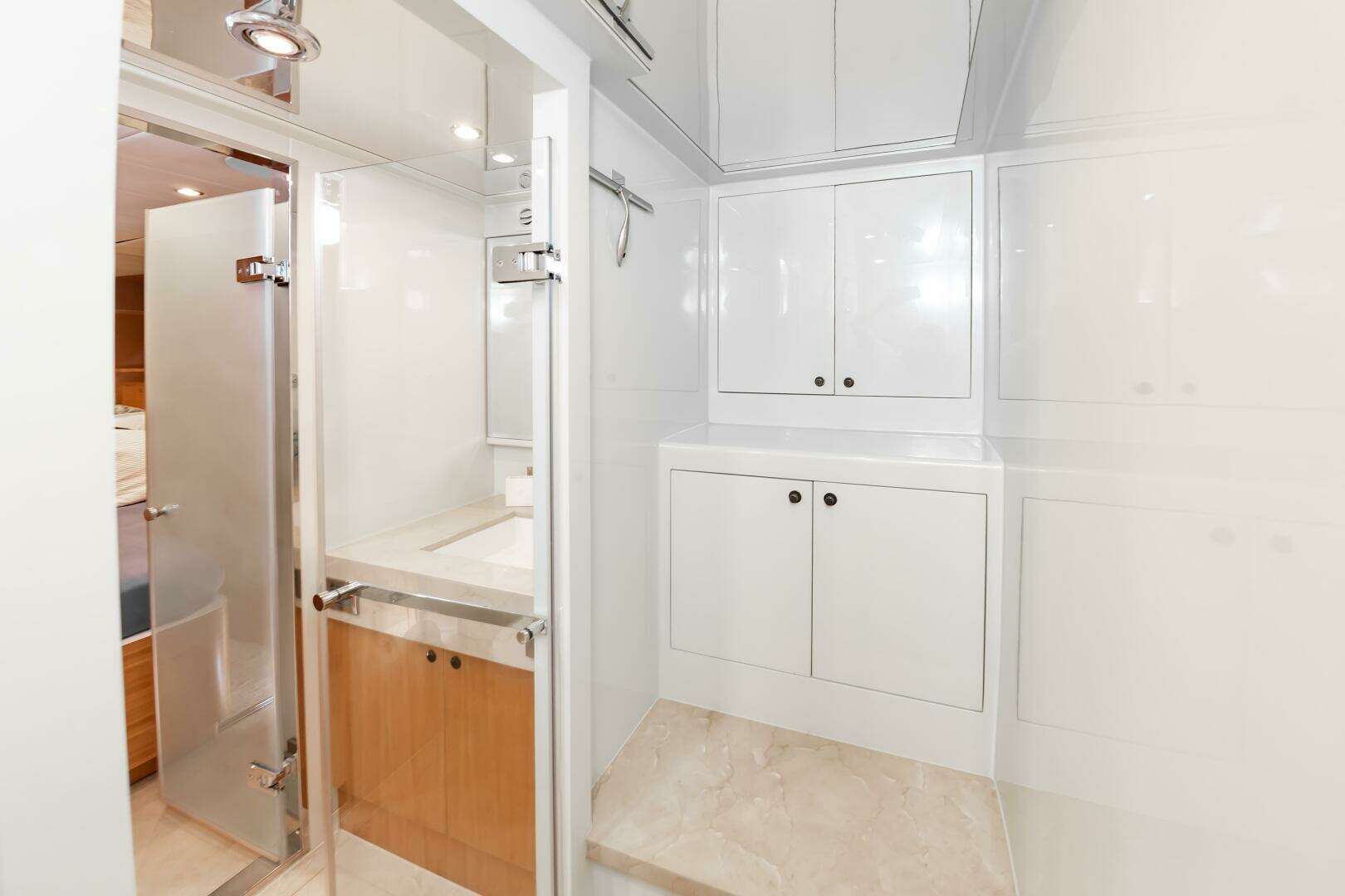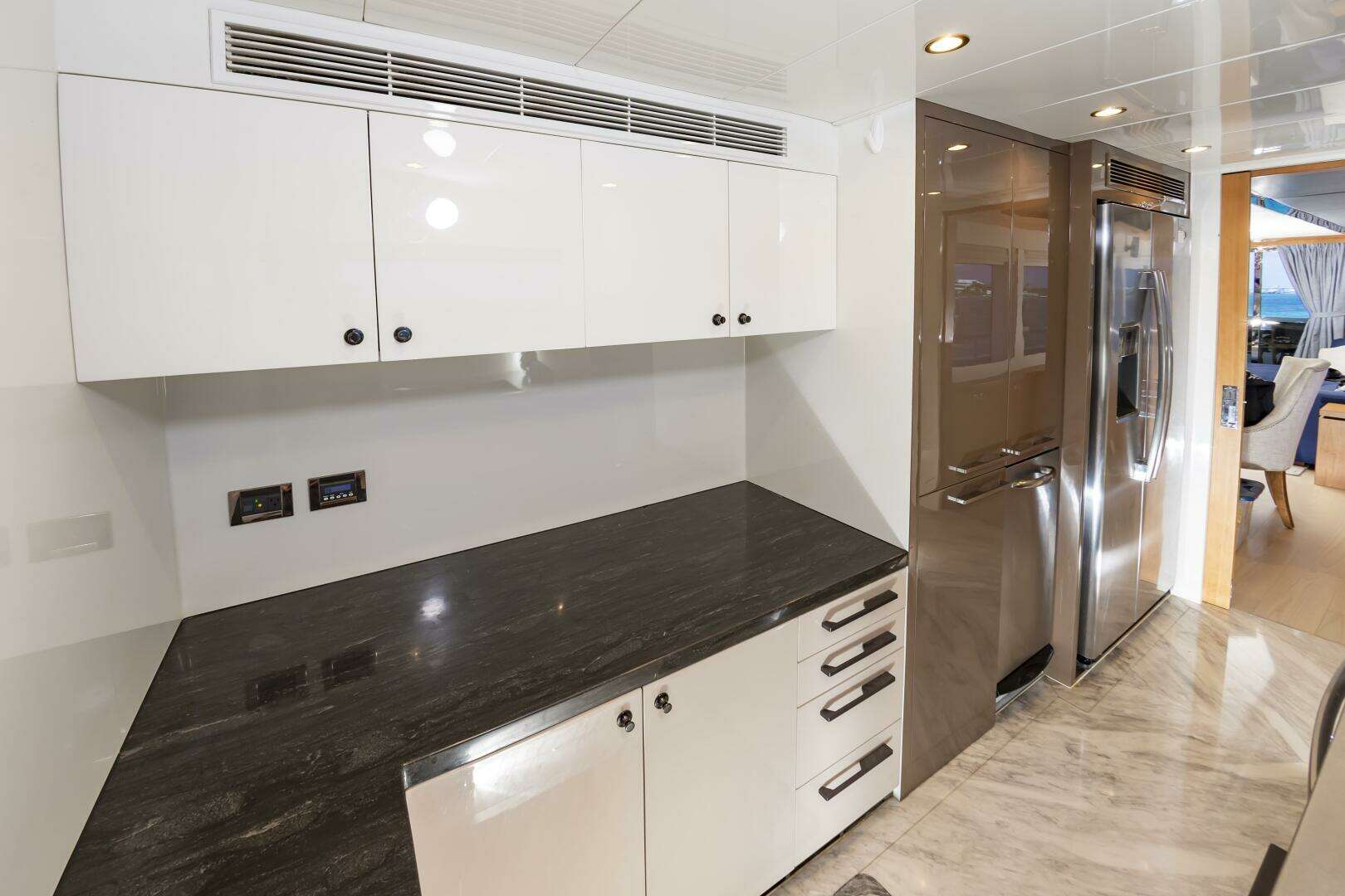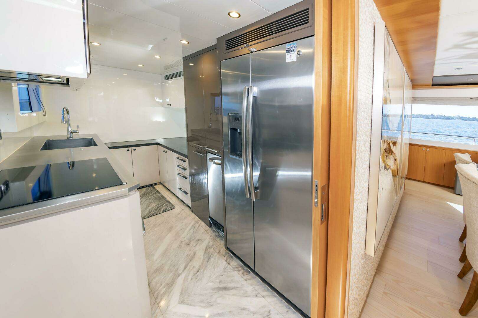 - Located in the Port Forward area of the Main Salon deck you will find the Main Galley, with a Pocket Door to conceal this space when desired. Marble Flooring and Excellent Lighting.Port Side weatherproof door that provides direct access to the Port Side Deck