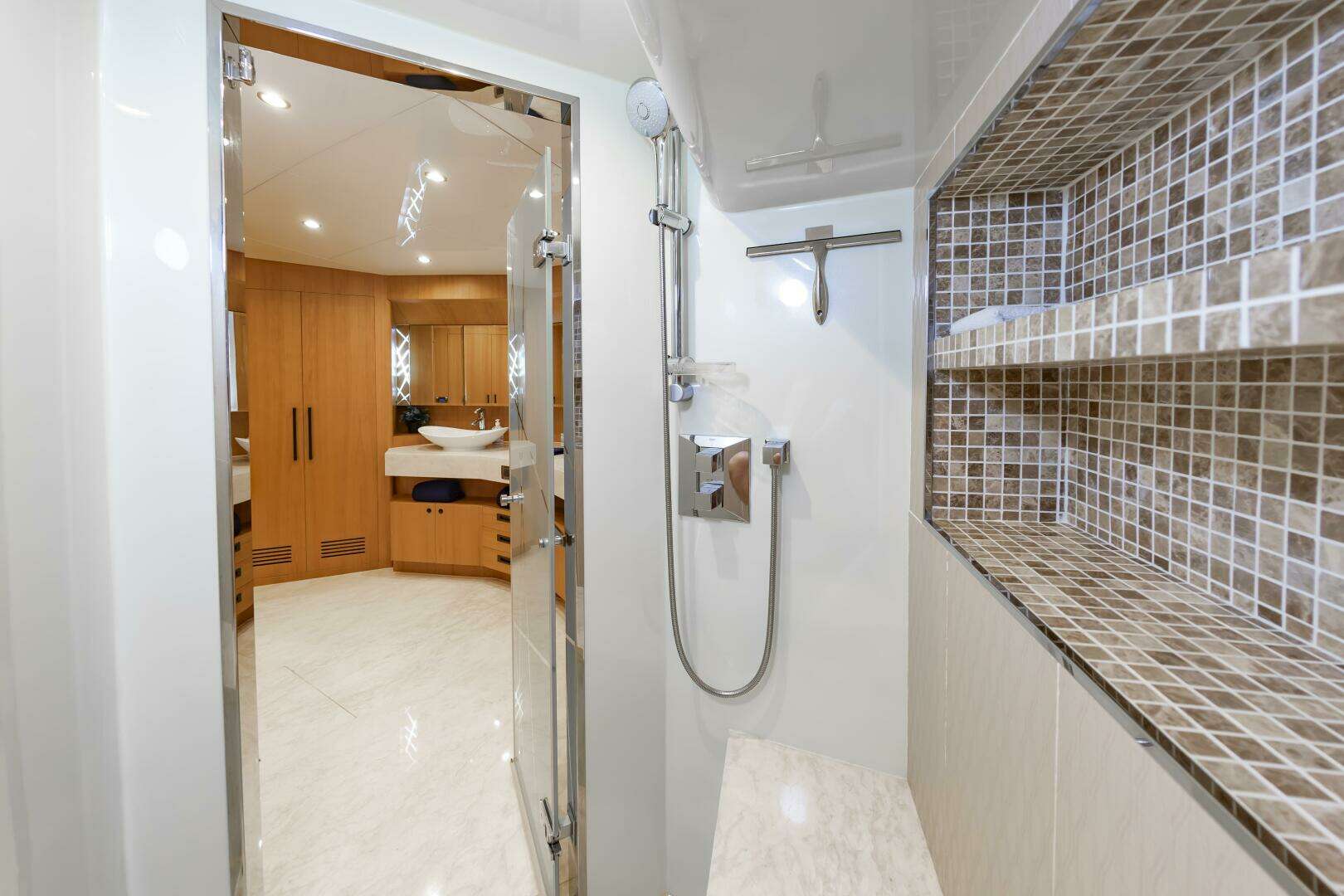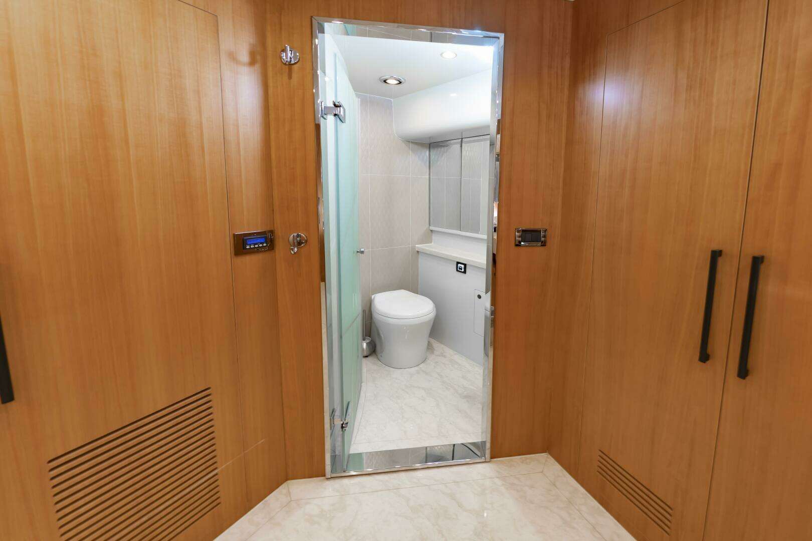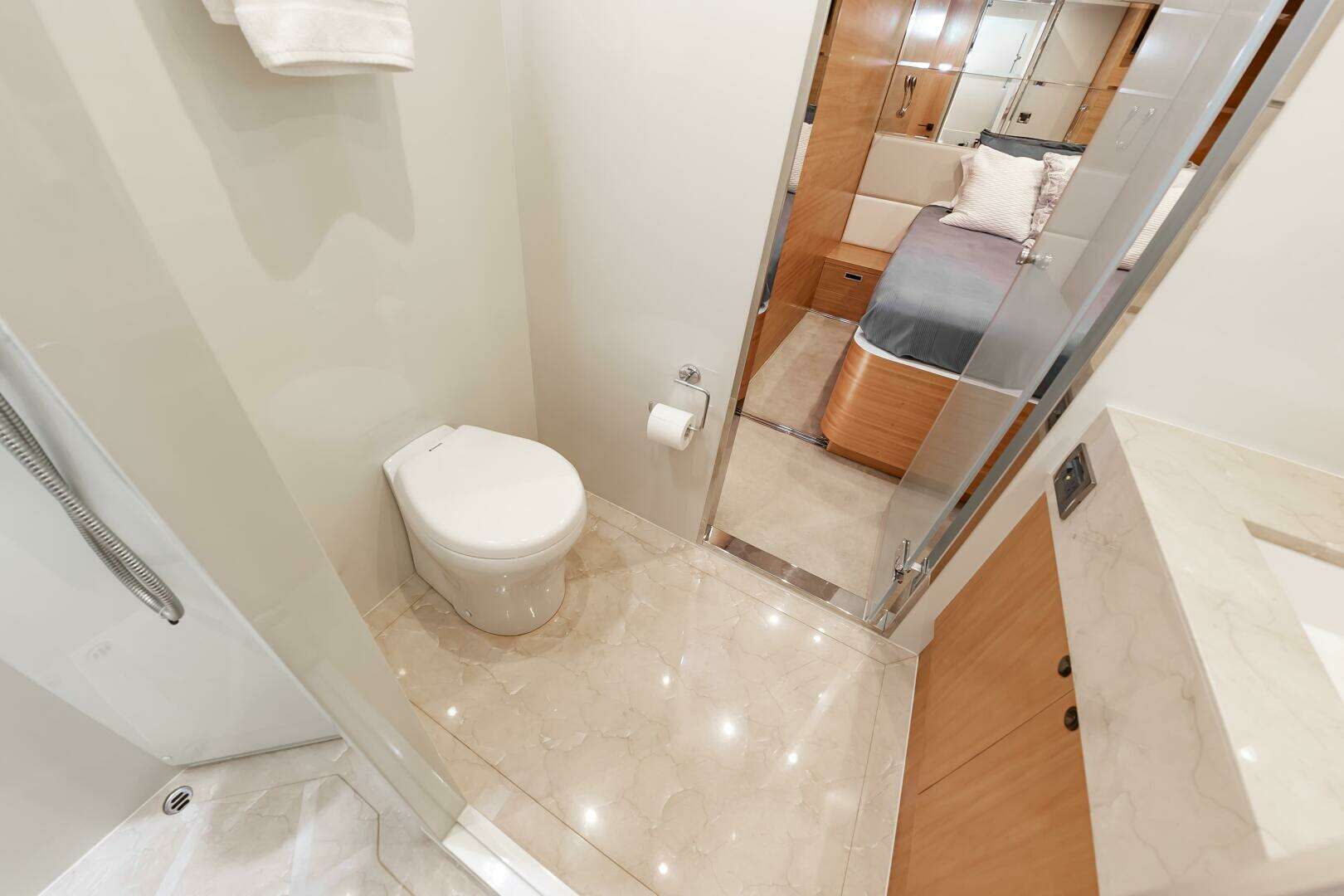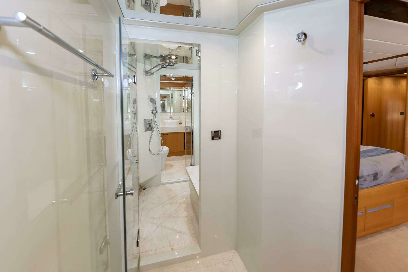 You will find the On-Deck Master Stateroom to be Stunning and Opulent, in every sense of the word. With 180 degree windows that look out onto the Bow , and electric window curtains when privacy is desired. The master Head and Shower space is open to the Master Cabin and down several stairs, enhancing the stunning feel of the Master Suite