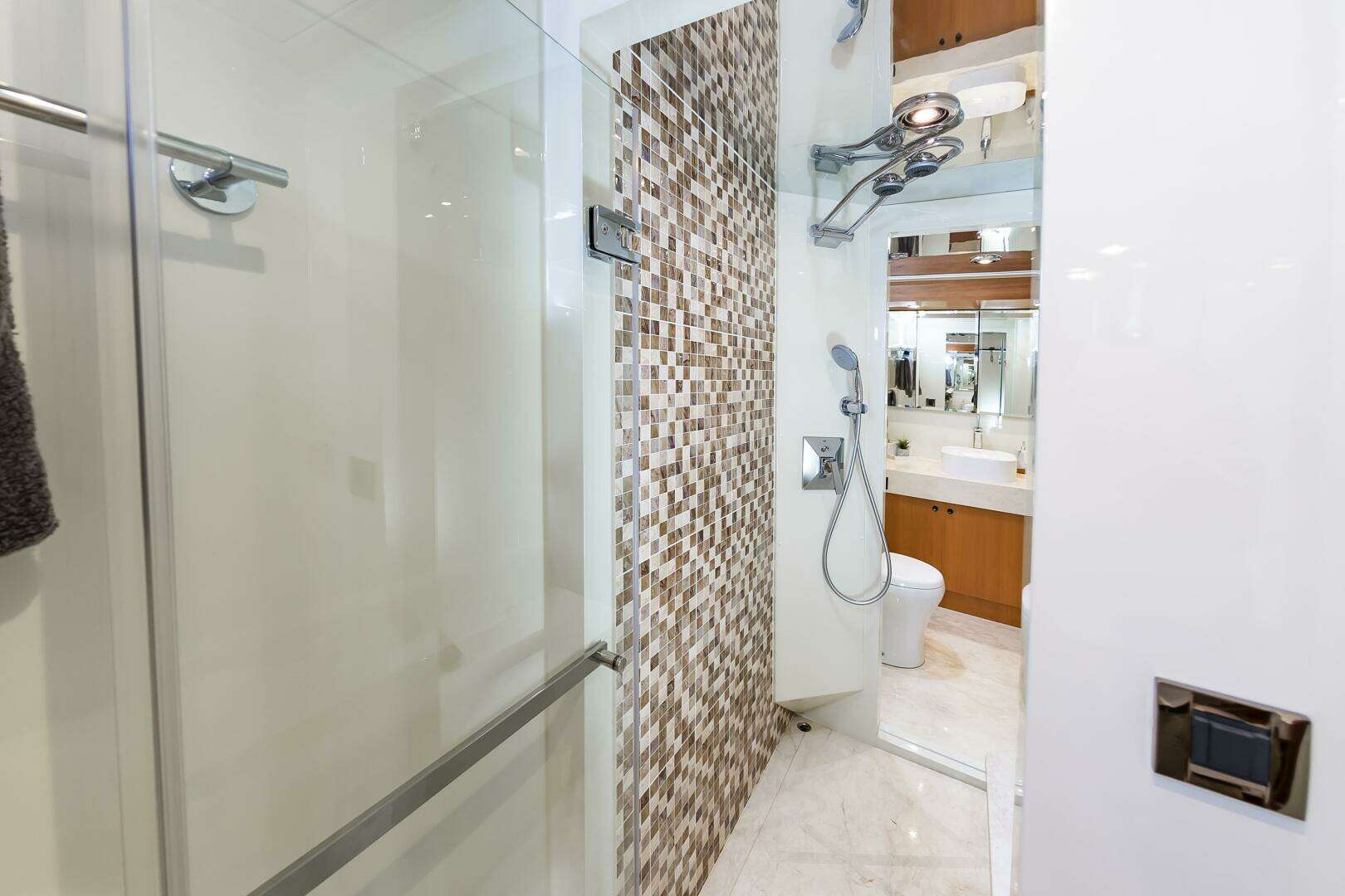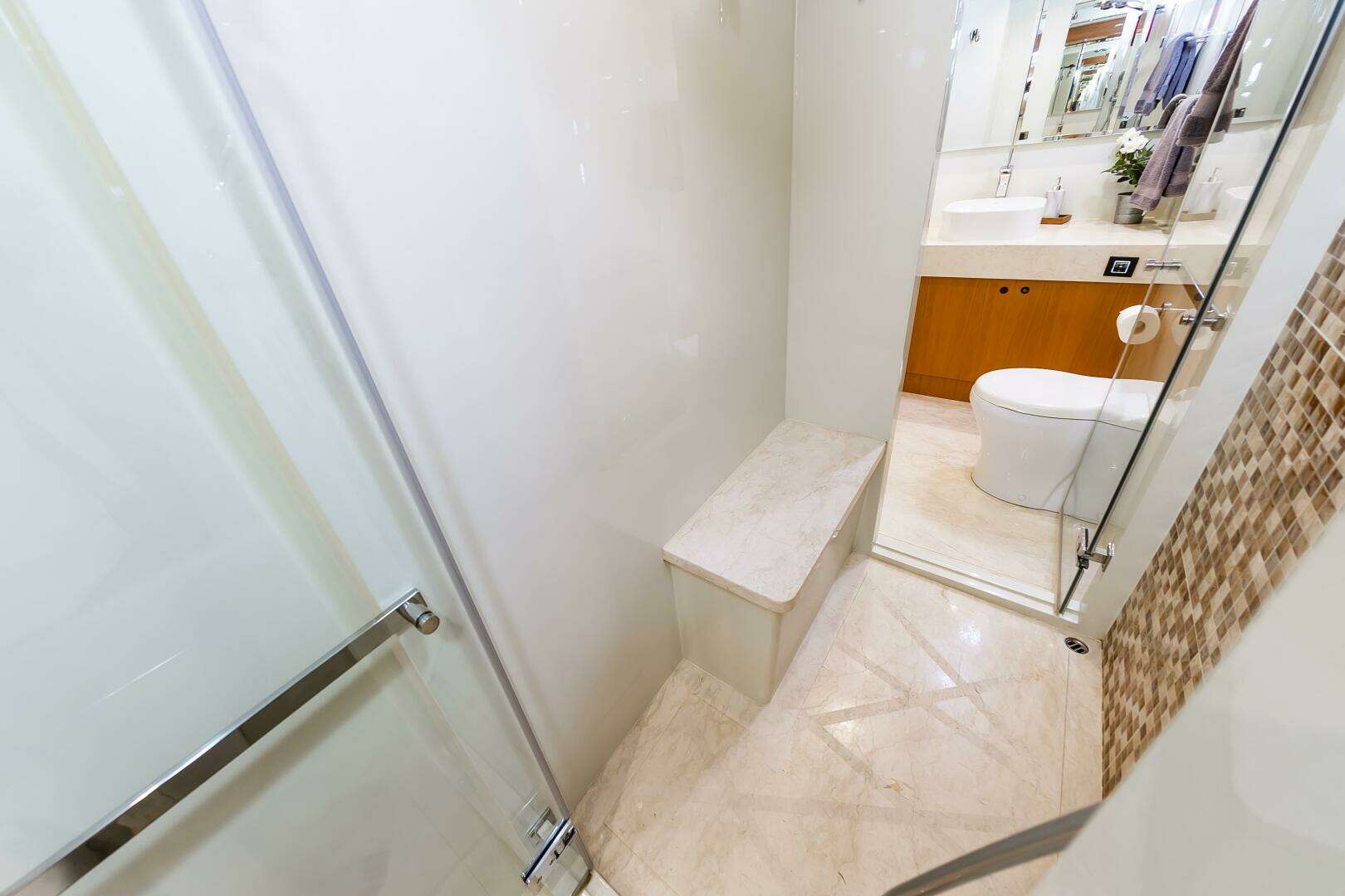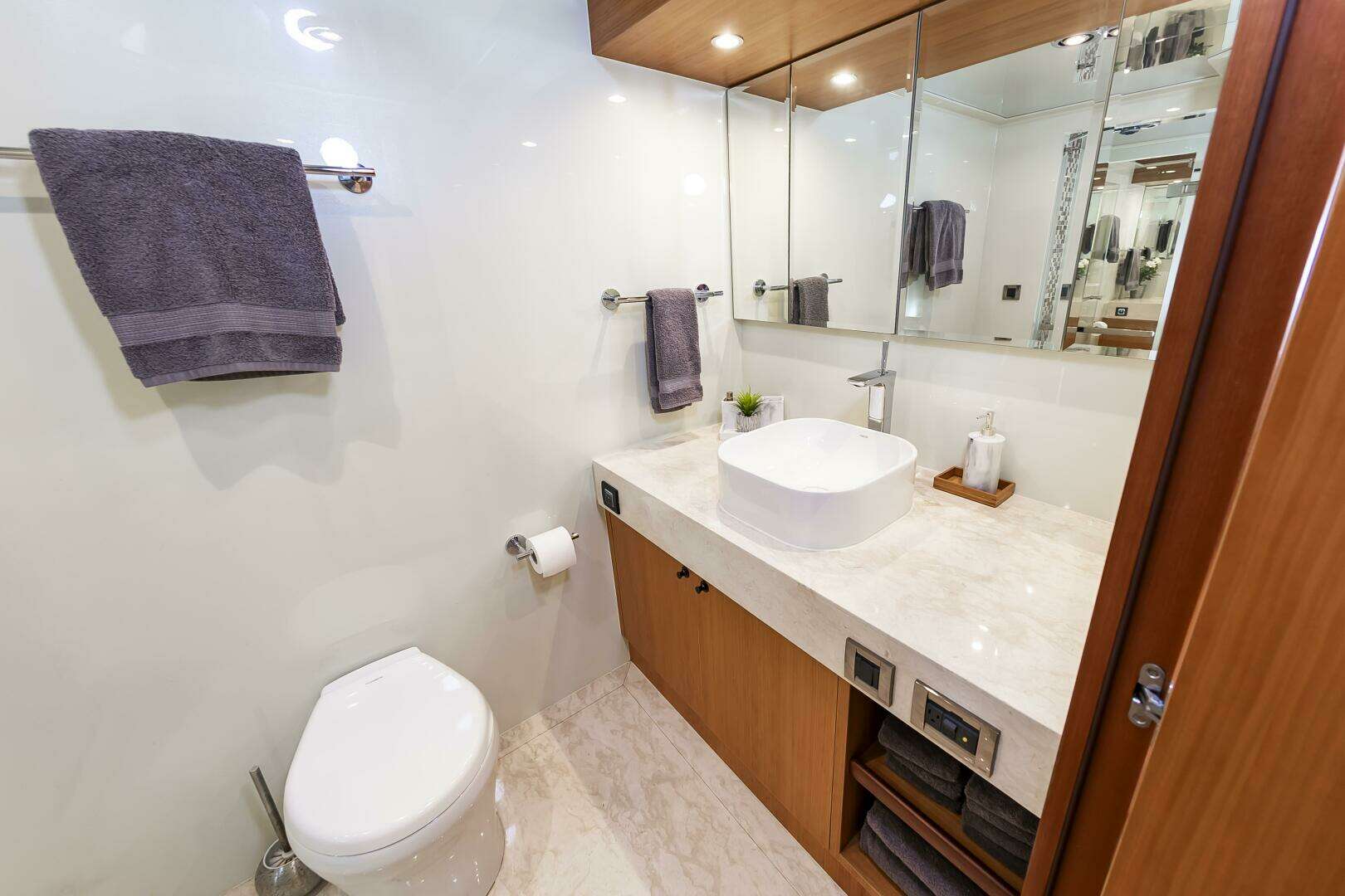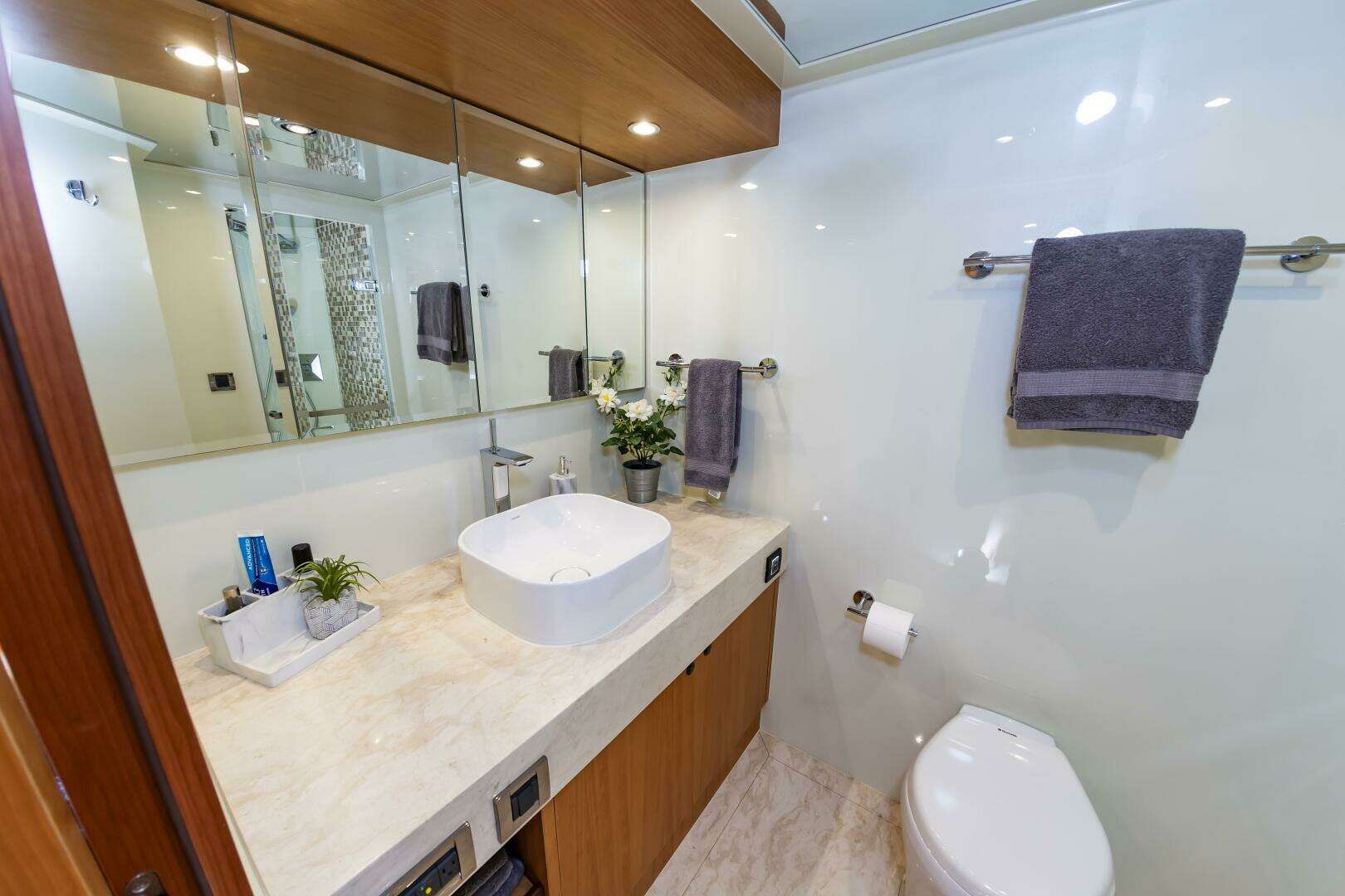 You will find the On-Deck Master Stateroom to be Stunning and Opulent, in every sense of the word. With 180 degree windows that look out onto the Bow , and electric window curtains when privacy is desired. The master Head and Shower space is open to the Master Cabin and down several stairs, enhancing the stunning feel of the Master Suite