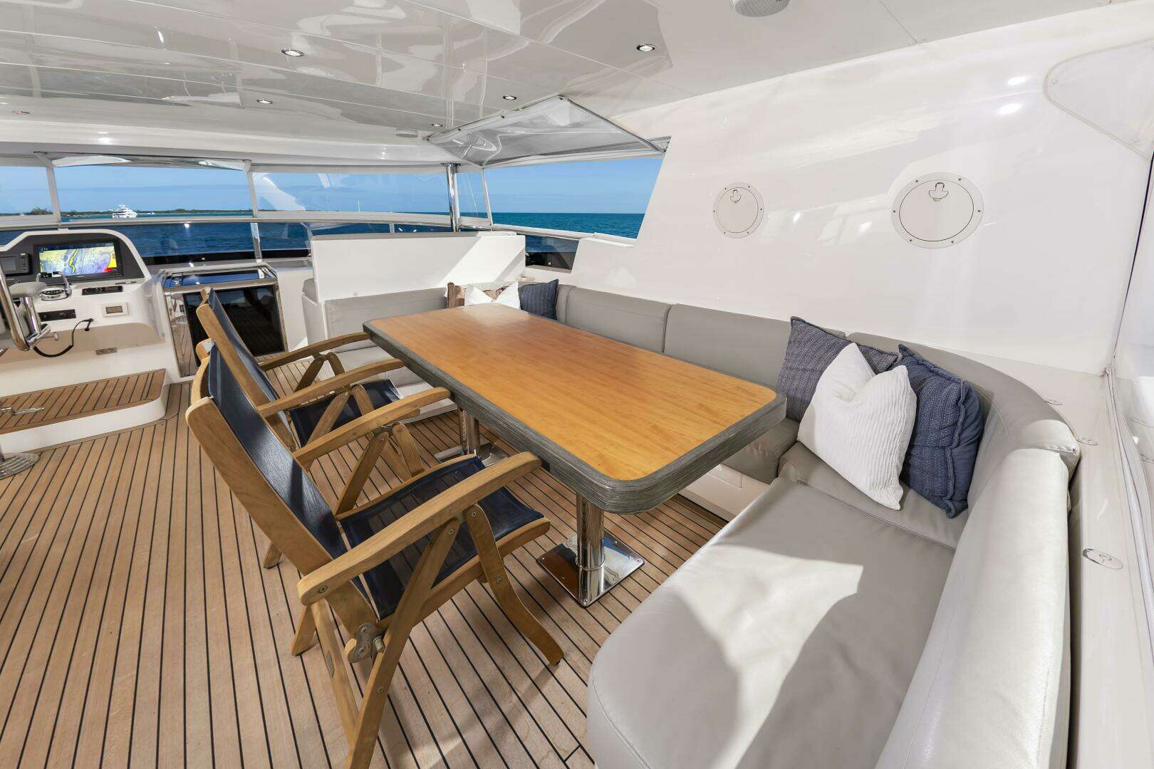 - Stbd side Dining Table with U-shaped booth seating, Sunbrella HD Leather upholstery and custom covers