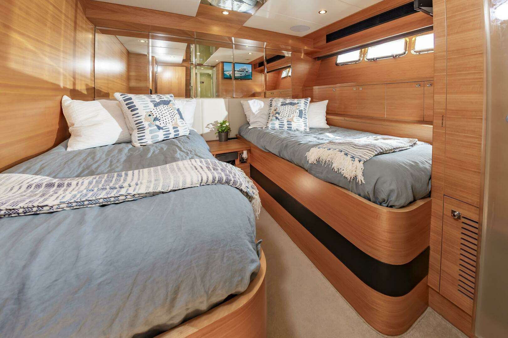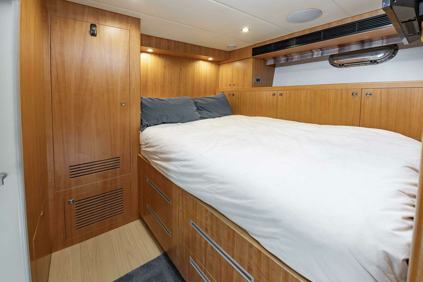 - Stbd side Crew Cabin: Privacy door, Upper and Lower Bunks, Overhead lighting and reading lamps, (2) storage compartments, Enclosed head and shower (Wet Head)