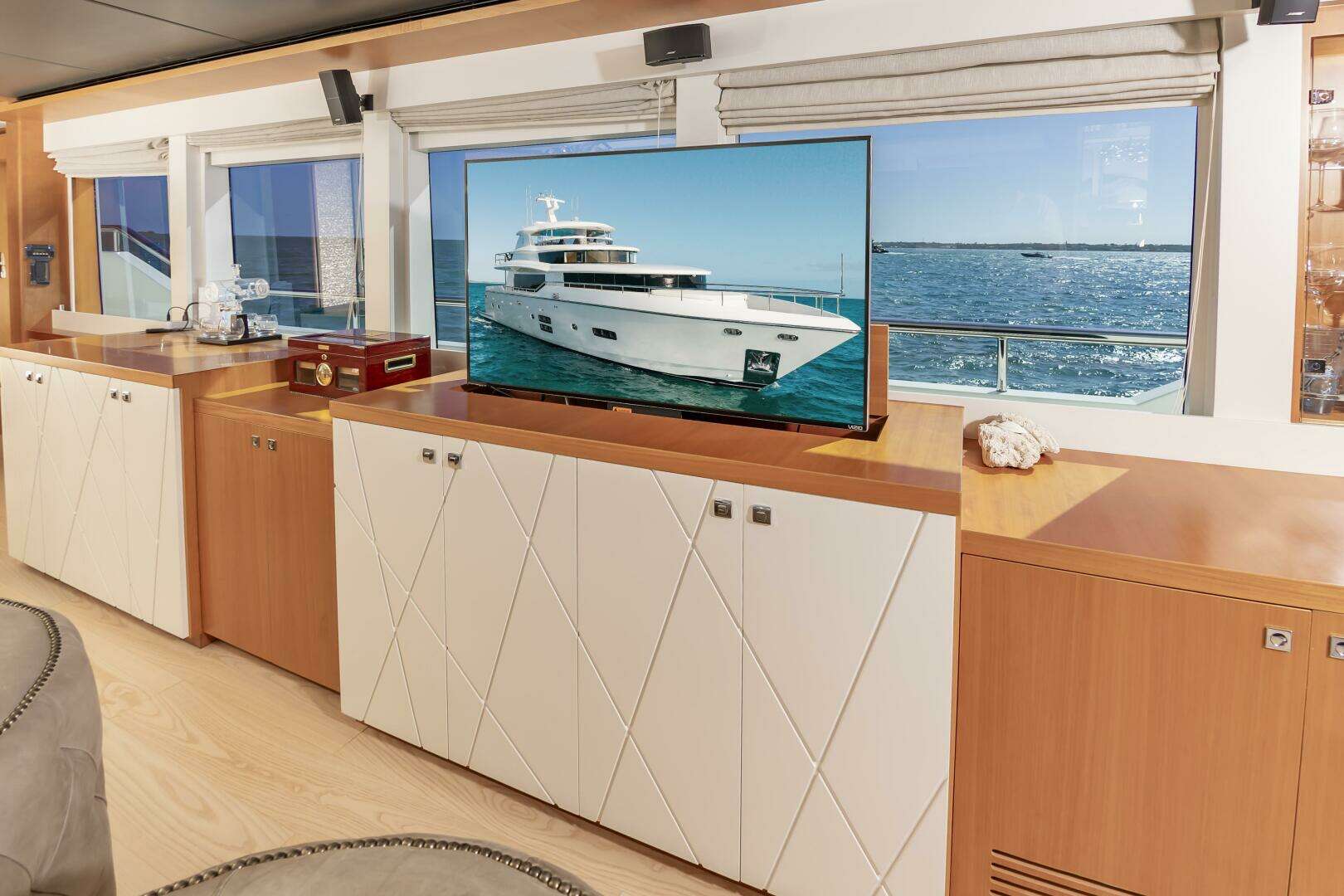 - Stbd side Bar area that includes an Isotherm glass front wine cooler (New 2023) and Bottle Storage space