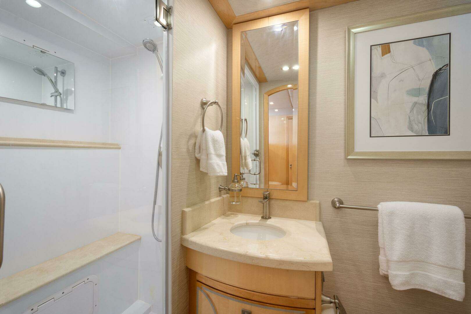 At the forward end of the main deck is the on-deck master suite, featuring a king-size berth, four closets (two walk-ins), and a spacious en suite bath with double sinks. Large panoramic windows fill the suite with natural light, creating a bright and private retreat for the owners.