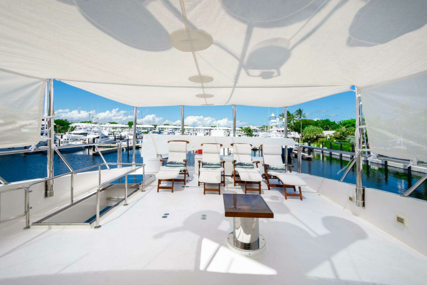The aft deck is designed for entertaining, featuring a large dining table that seats ten guests and can be divided and lowered for casual cocktail gatherings. Amenities include an ice maker, refrigerator, and a fold-down flat-screen TV overhead, with a staircase to the bridge deck located on the starboard side.