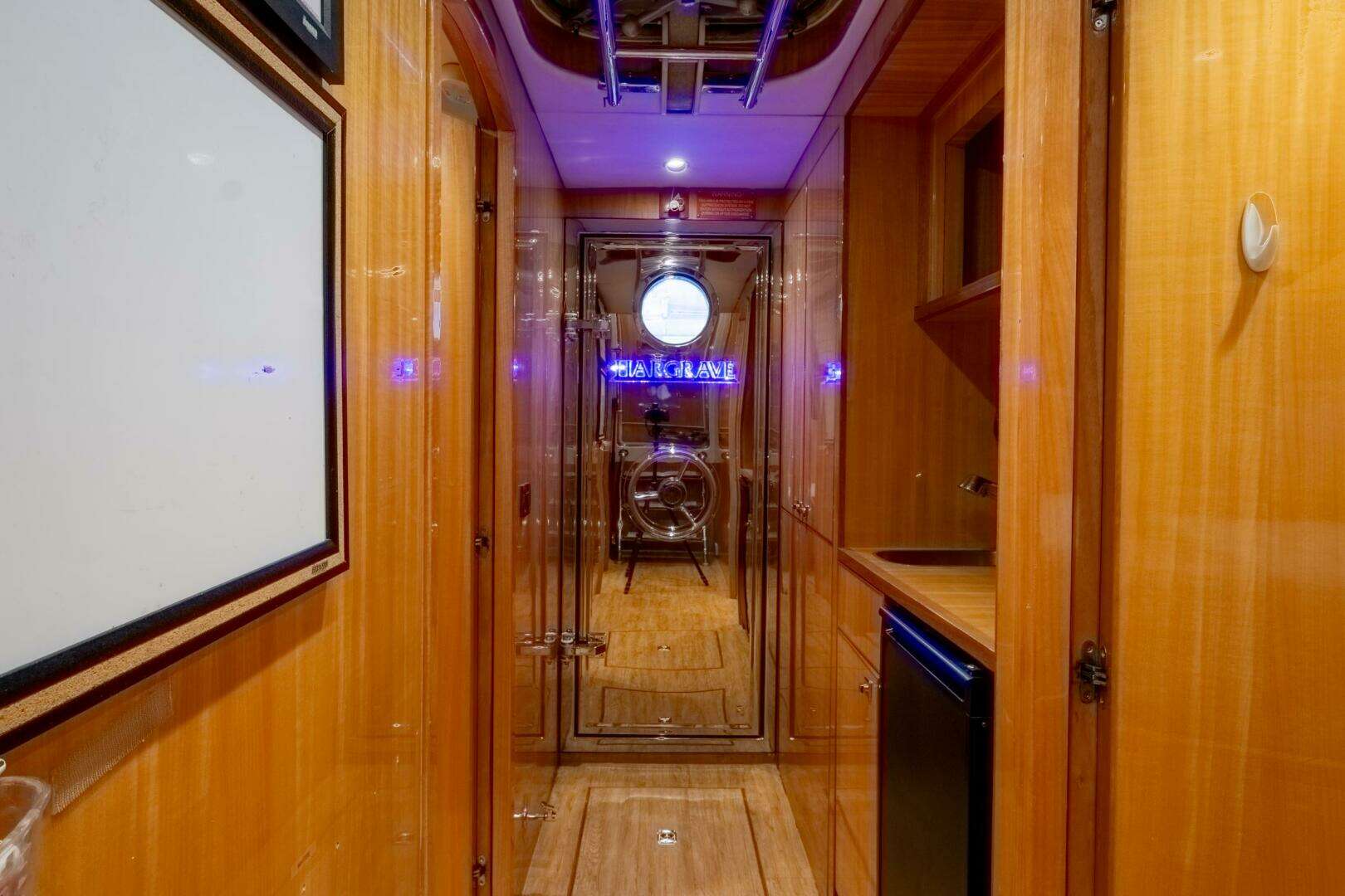 Located aft of the guest accommodations, the full-beam engine room reflects Hargrave’s reputation for accessible and well-organized machinery spaces. All key systems—including the CAT engines, twin generators, watermaker, fuel management, and electrical systems—are easily serviced and well maintained.