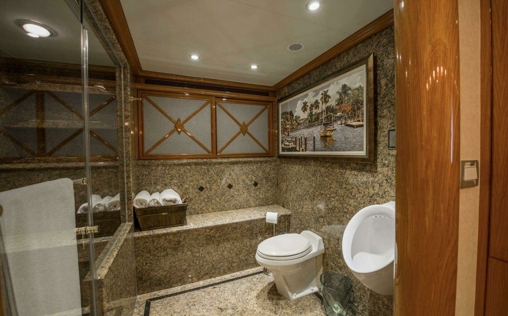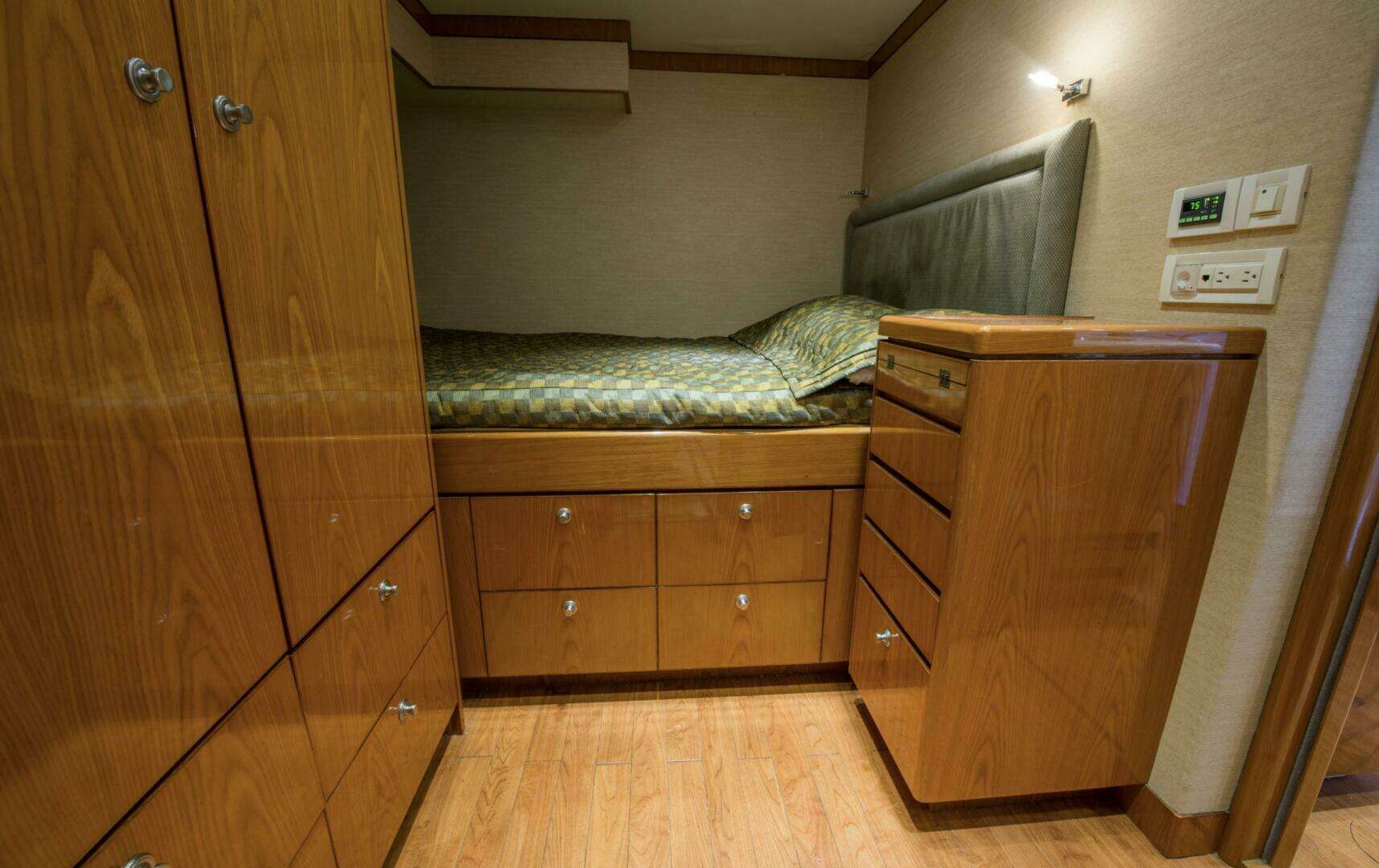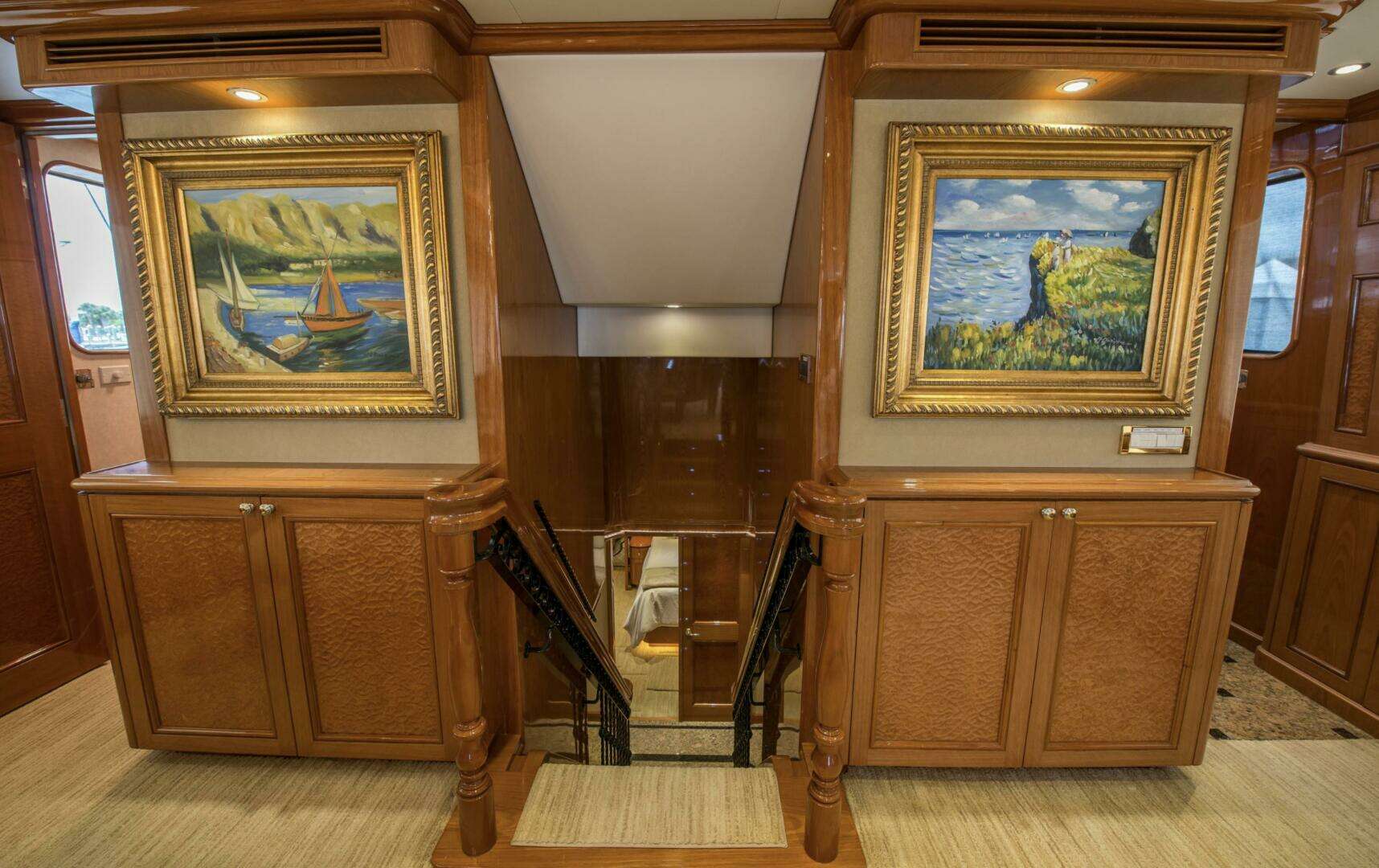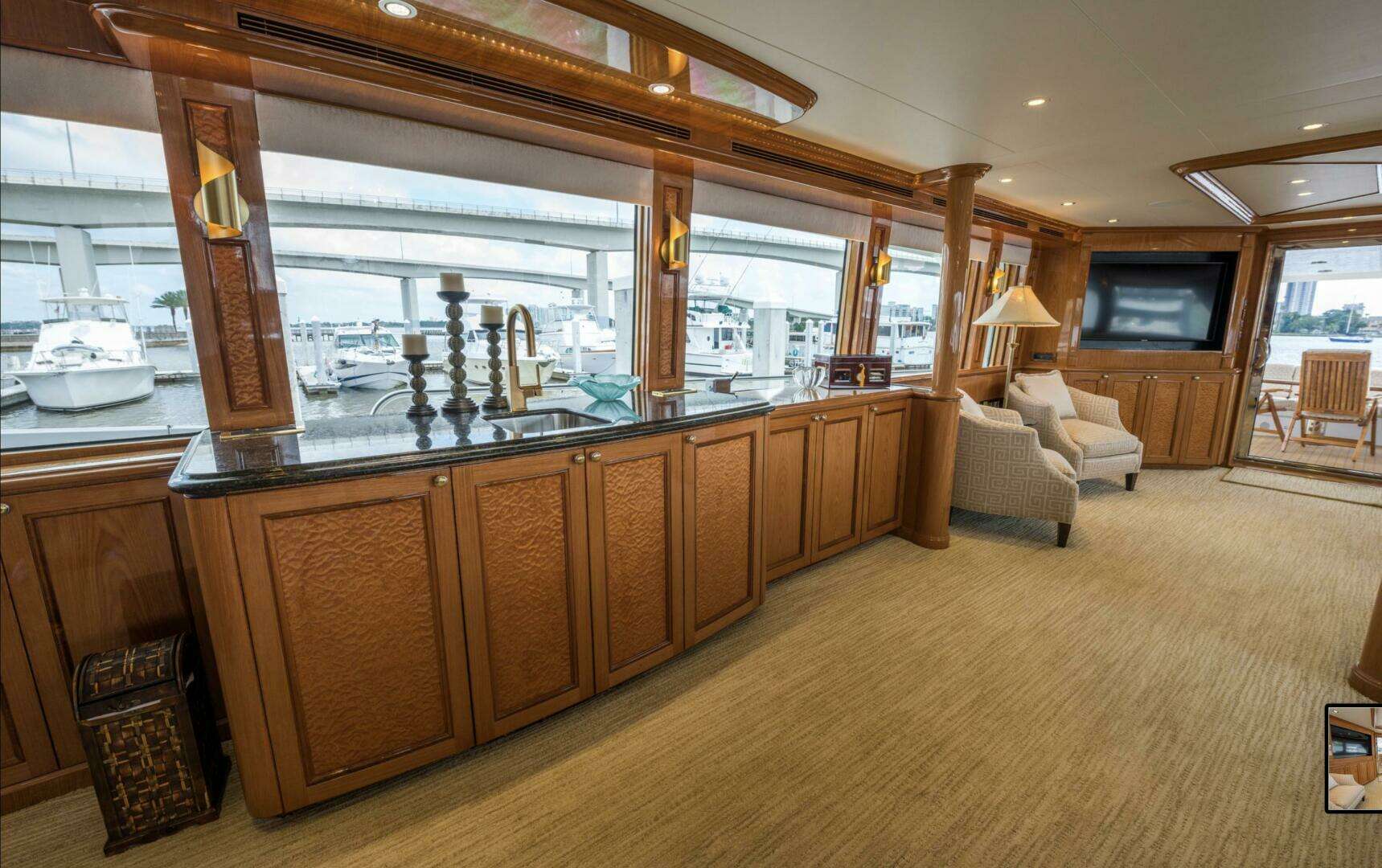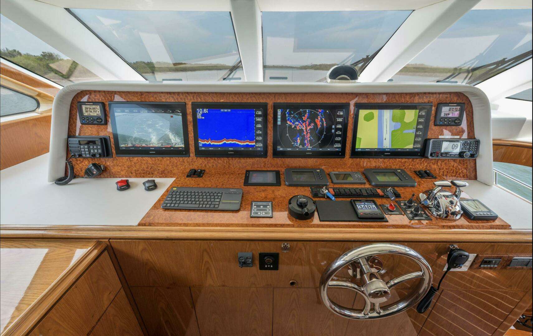 Twin Caterpillar C32 diesels (1,652 HP each, total 3,304 HP) power FOOTLOOSE to a thrilling 26-knot top speed and efficient 18-knot cruise. Her 5,300-gallon fuel tanks yield a 1,267-nm range, ideal for transoceanic runs or island-hopping. Quantum zero-speed stabilizers ensure silky rides and reliability. Upgraded Garmin electronics suite includes Four Garmin 8617's, radar, autopilot, and AIS for effortless command from the raised pilothouse or flybridge helm.