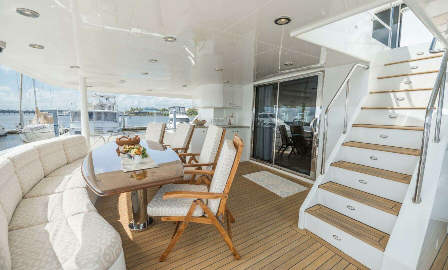 FOOTLOOSE sleeps 8 in four lavish en-suite staterooms: a full-beam main-deck master with king berth, walk-in closets, and spa bath; a forward VIP with another king; and two amidships queens. Warm teak interiors, neutral palettes, and refreshed soft goods create serene spaces. The salon-dining flows to a pro galley and wetted bar. Crew of 3-4 quarters separately with full amenities.