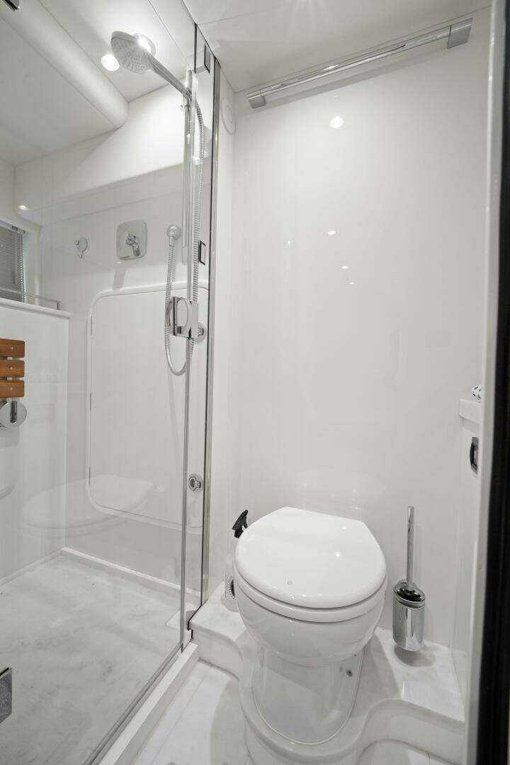 - Bathroom with separate stall shower, electric freshwater toilet and washbasin