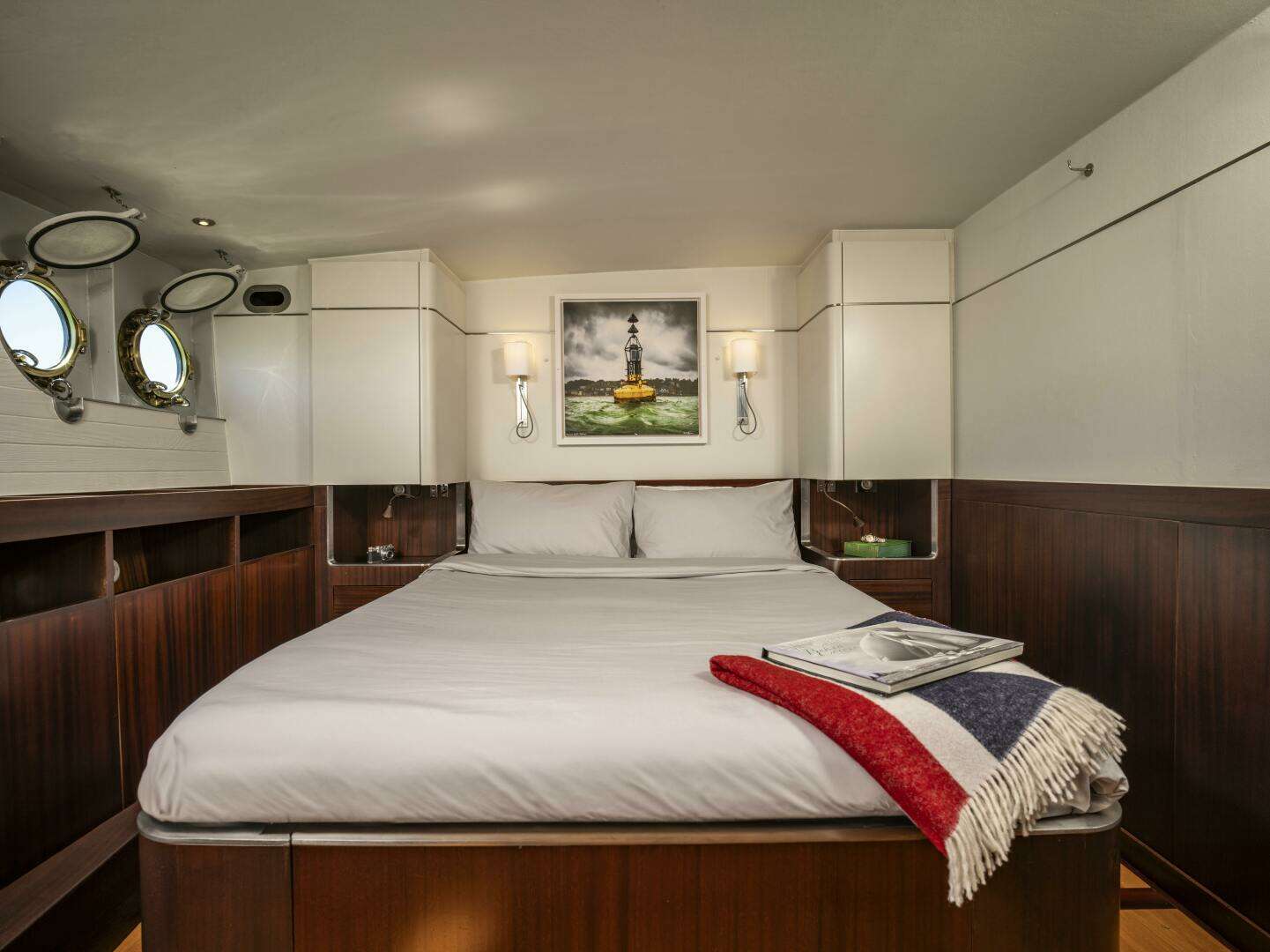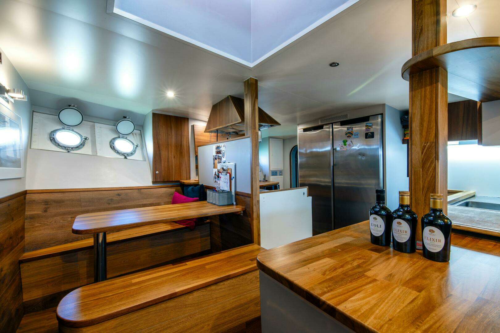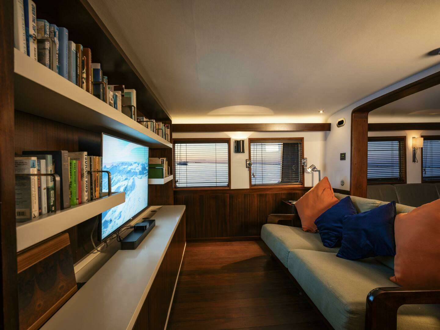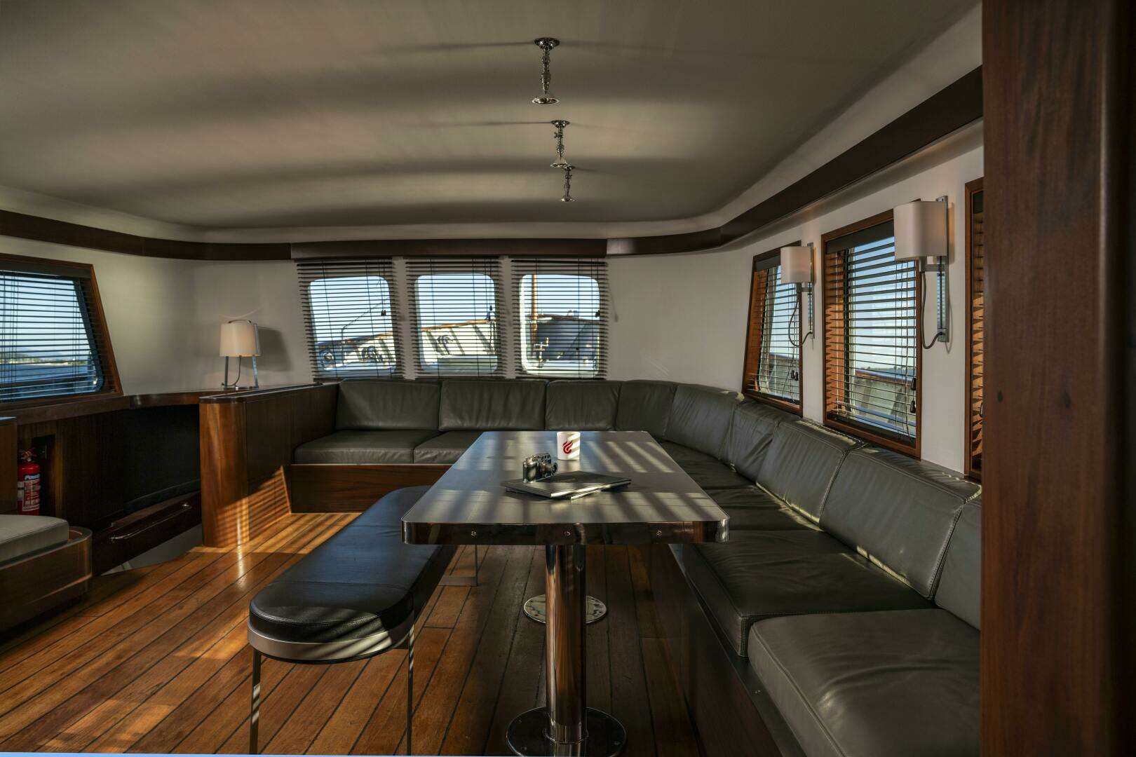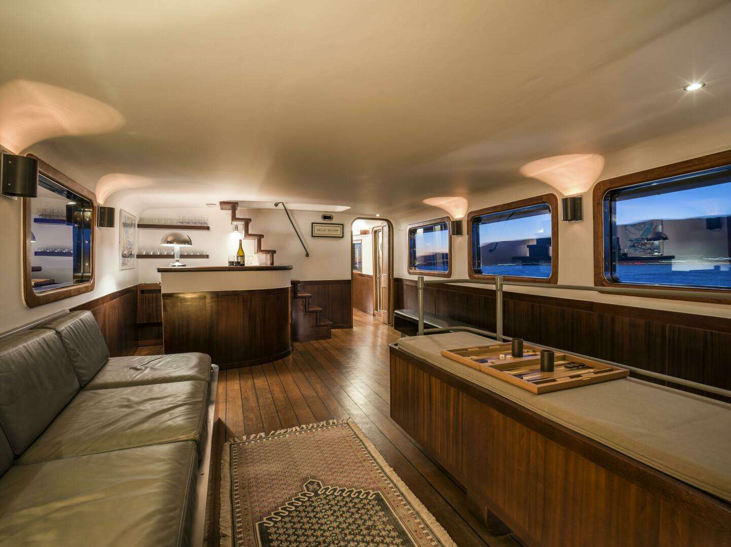 In the mid-80s, she joined the French Navy as a training vessel and was later acquired by photographer Peter Lindbergh in 2001, undergoing a significant refit. Christian Liaigre contributed to her interior design from 2005 to 2016, with his primary input in the 2015/2016 refit, achieving a perfect balance between modern aesthetics and traditional charm with dark wood flooring, paneling, and leather accents. The open-plan layout creates a sense of spaciousness and seamlessly connects the living spaces throughout the yacht’s interior.