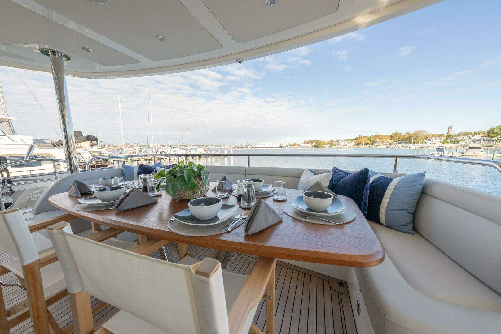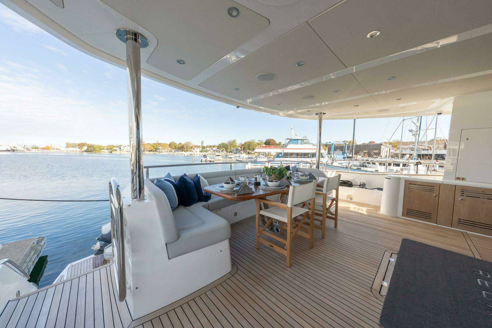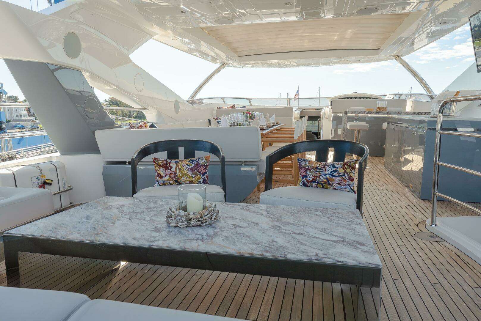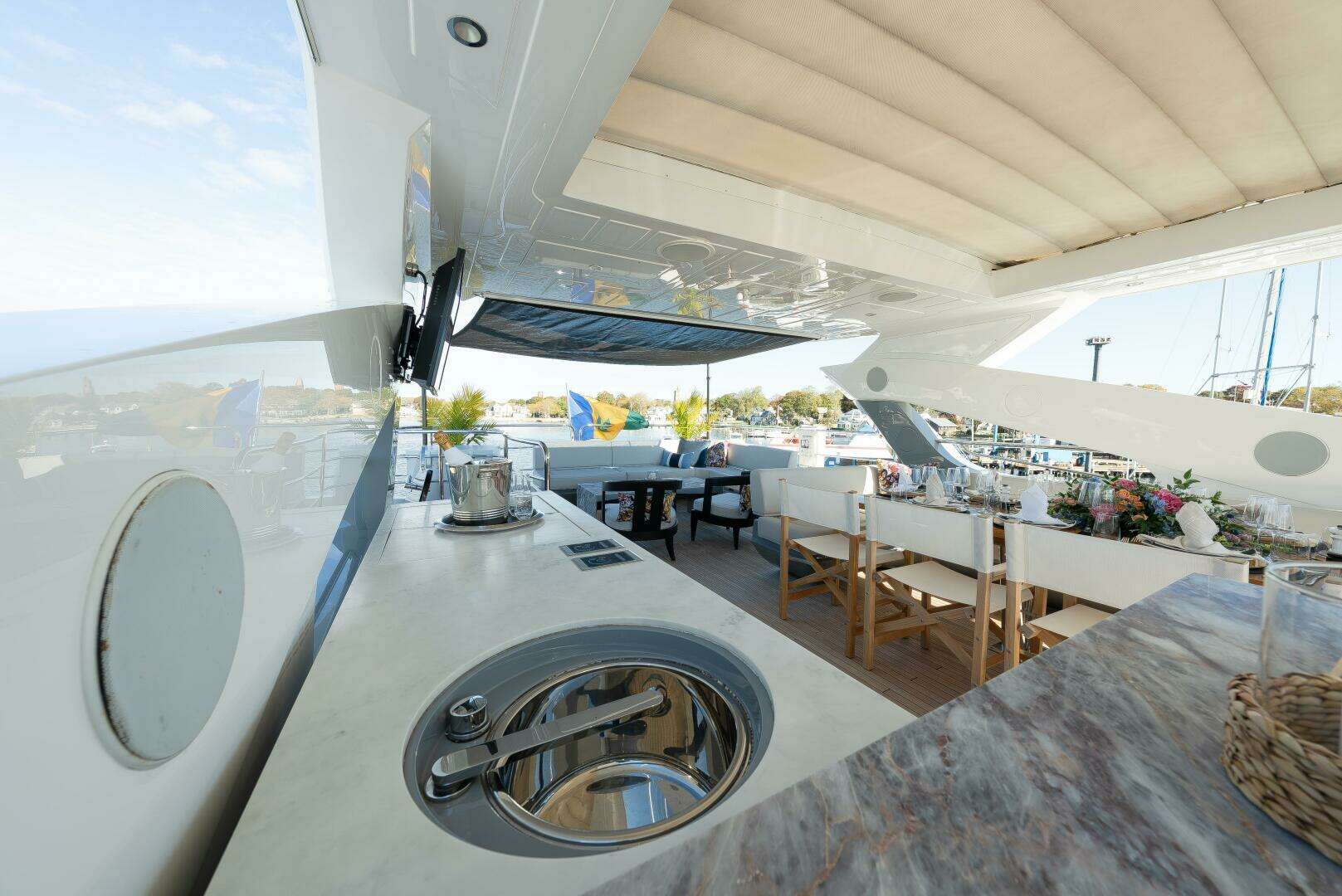 Above deck, the flybridge serves as the yacht's social hub, featuring expansive areas for dining and lounging. A custom wet bar is outfitted with premium amenities, including a refrigerator, ice maker, and grill, ideal for hosting gatherings. Additionally, the aft deck lounge with a coffee table offers a more intimate space for relaxation. The hardtop sunroof and retractable sunshade canopy provide the flexibility to enjoy open skies or cool shade, creating the perfect setting for entertaining or unwinding while taking in sweeping, panoramic views.