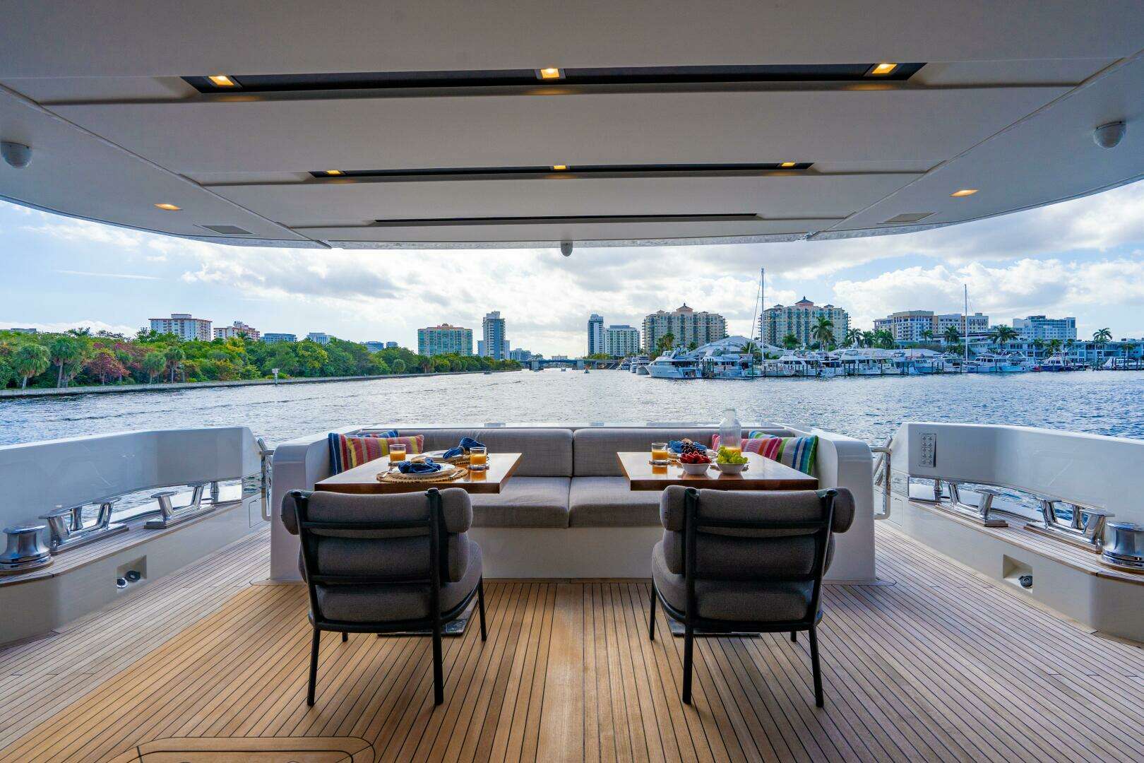 One can board SWEET VIRGINIA from the swim platform to the aft deck or via side boarding. Once aboard the aft deck, one will find a spacious area with a built-in settee, teak table, and chairs. This area is the perfect area for entertaining, watching water sports, or for breakfast and lunch. From the aft deck, one can enter the main salon through a set of double glass doors.