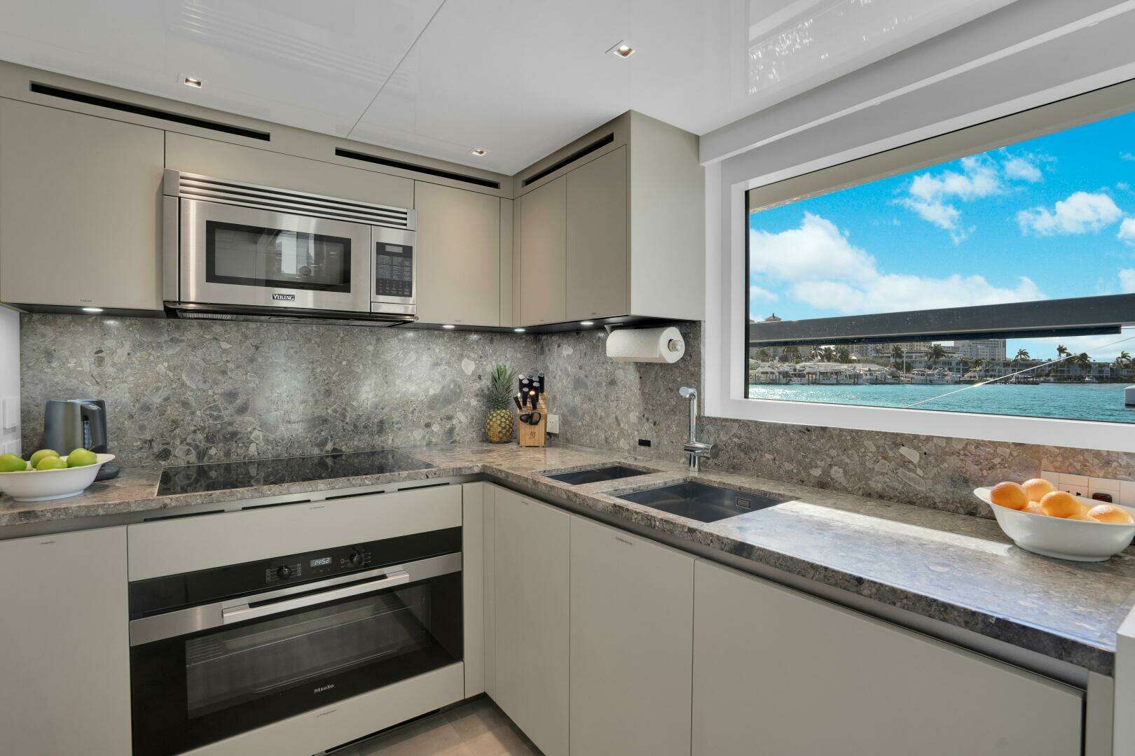 Back in the salon, one can go to starboard and forward to find the on-deck galley. The galley is well-equipped and set up to cook gourmet meals for guests. Galley has ample counter space, a refrigerator, cooktop, and oven. From the galley, one can go down a set of stairs to the crew area.