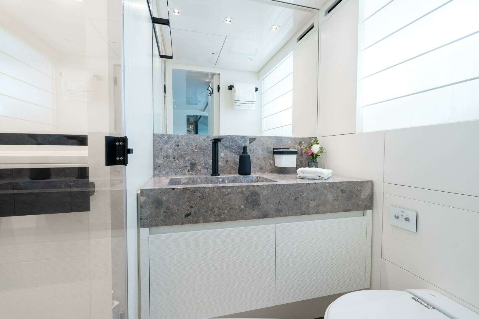 To port and forward, one will find a guest corridor with a day head. Continuing forward, one will find the Owner’s Stateroom. The Owner’s suite offers a king berth, and a large ensuite bath with stone sink and shower, toilet, and bidet. The owner’s area offers ample storage and a walk-in closet that is forward and down a couple of stairs.