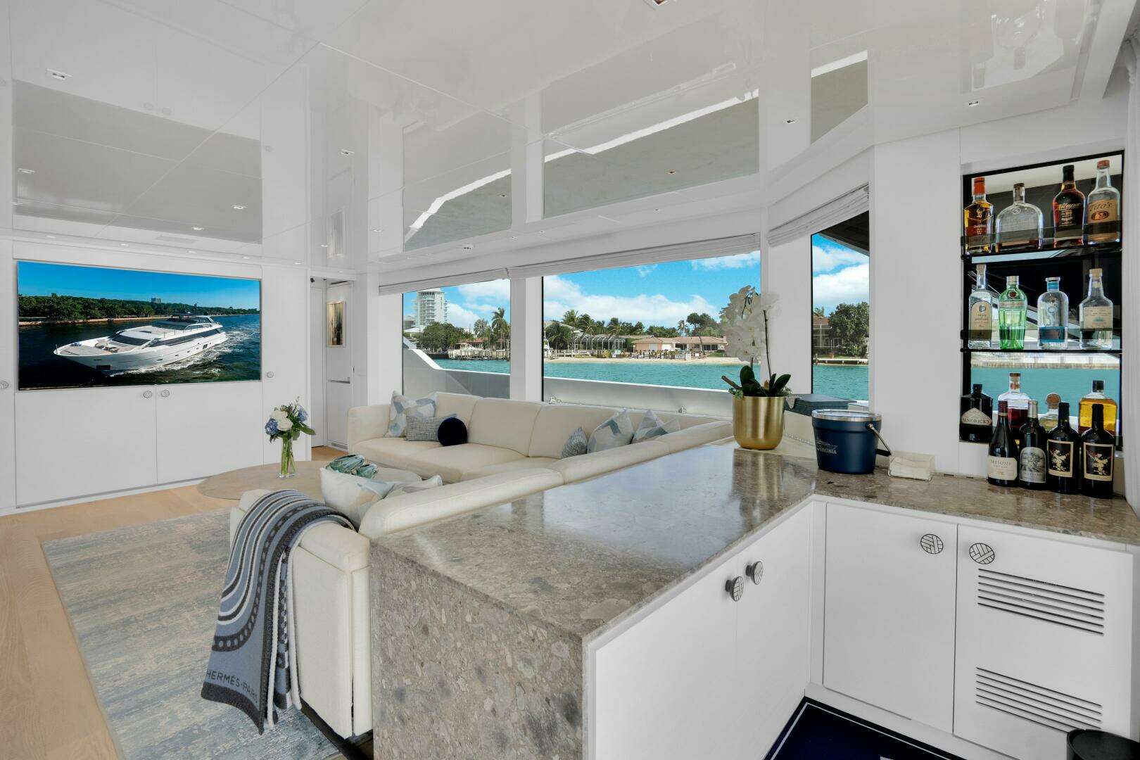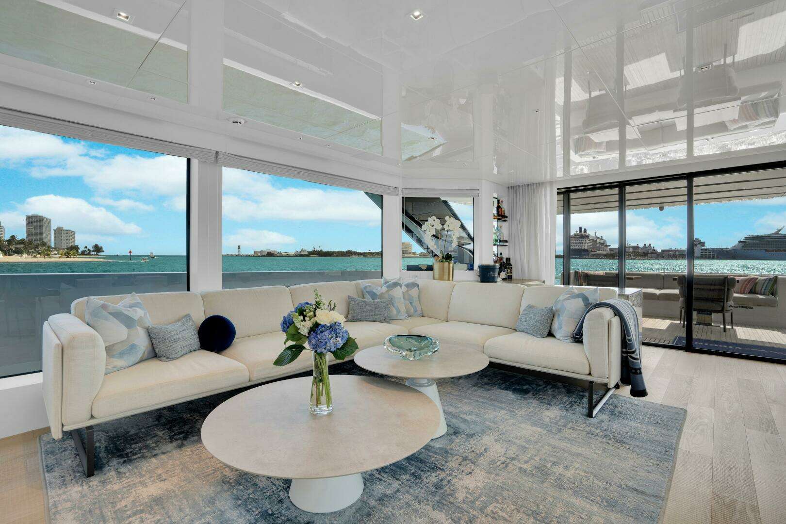 SWEET VIRGINIA is an impressive 2023 SL96A, featuring an innovative asymmetrical design that increases main deck volume by 15%. The salon is bathed in natural light thanks to floor-to-ceiling windows, creating a harmonious connection with the ocean views.
