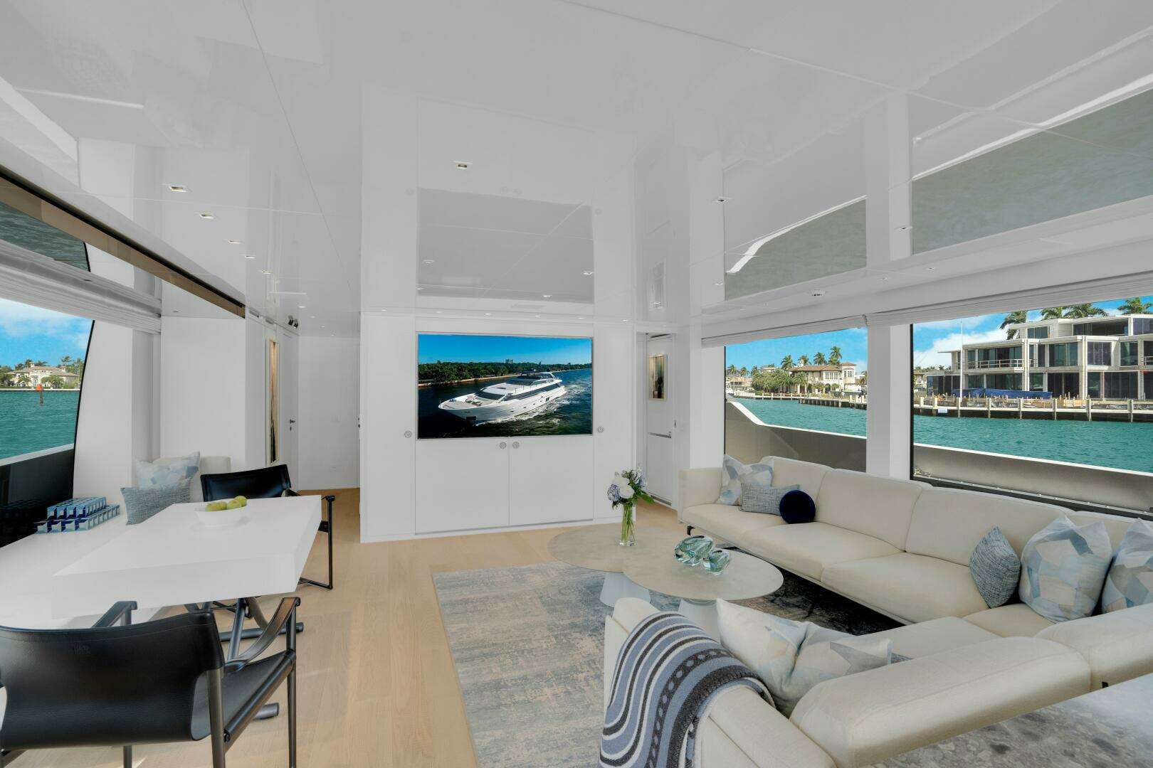 Once in the main salon, one sees the innovative asymmetrical design that offers additional volume to the main deck. There is an outboard lounging area to port and a table perfect for gaming, coffee, or breakfast. To starboard, one will find an L-shaped settee with coffee tables. The Salon offers large windows, white and airy décor, and light wooden flooring. There is a large TV on the forward bulkhead that is easy to see from anywhere in the salon.
