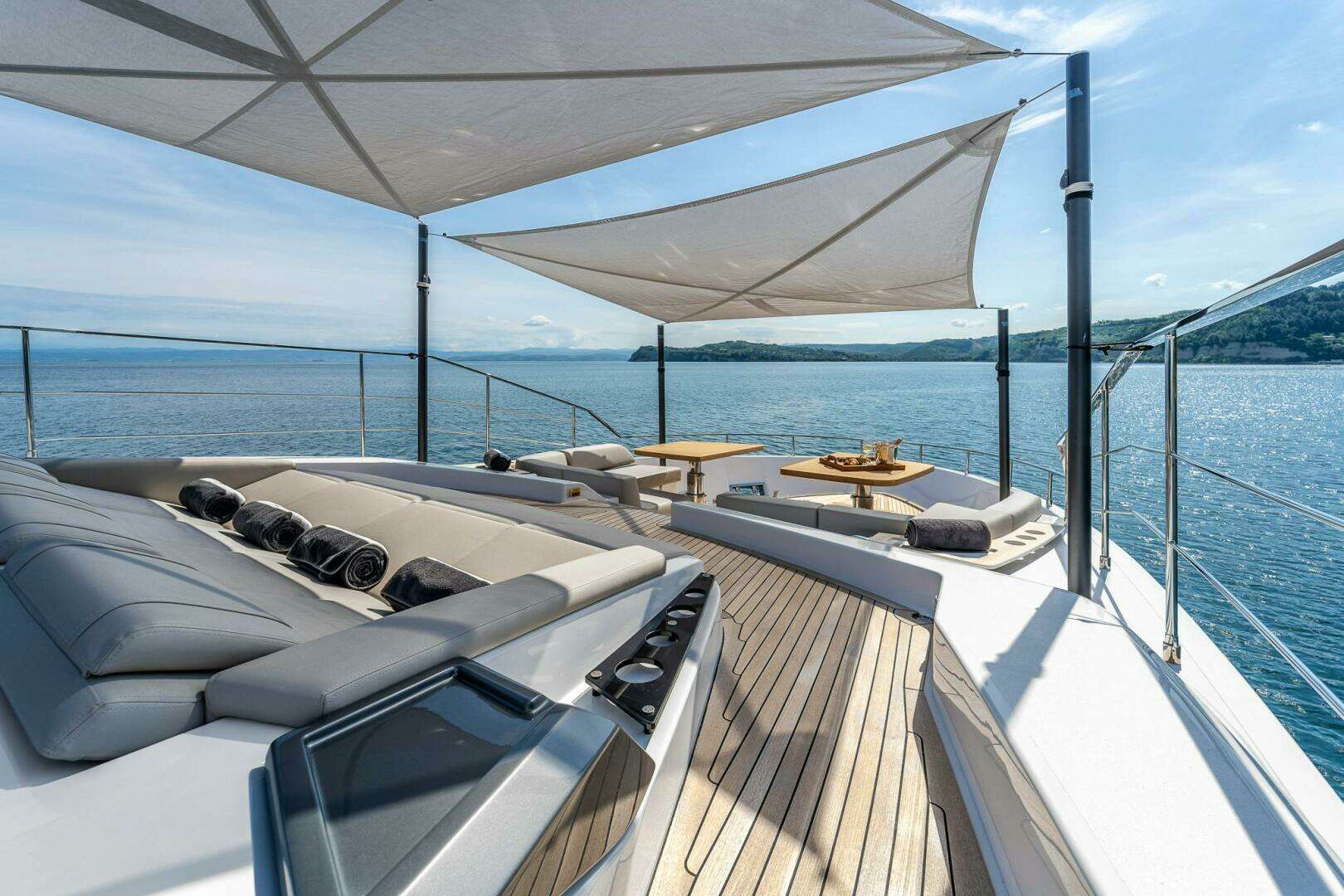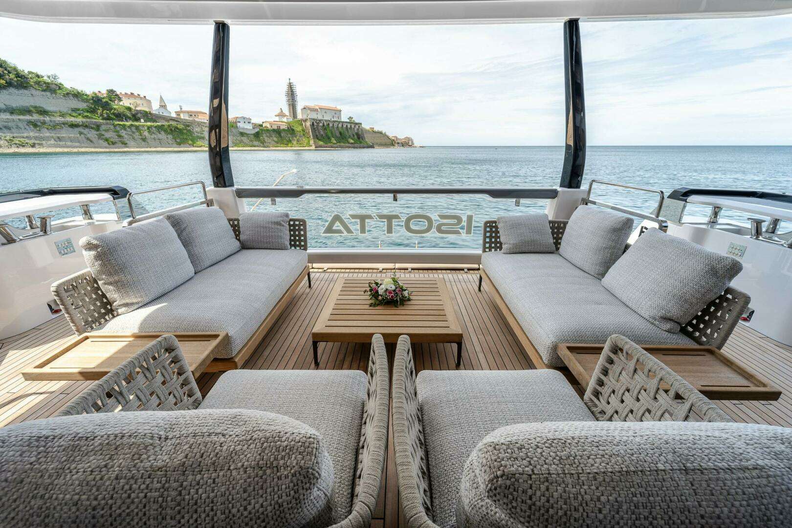 One will board Isotta via port or starboard side boarding doors at the aft deck, or from the swim platform with convenient passarelle. The swim platform is hydraulic and covered with teak. There is a large aft facing built-in lounge seating area on top of the powered tender garage door at the transom. The garage can store a tender and jet ski or two jet skis with room for storage.