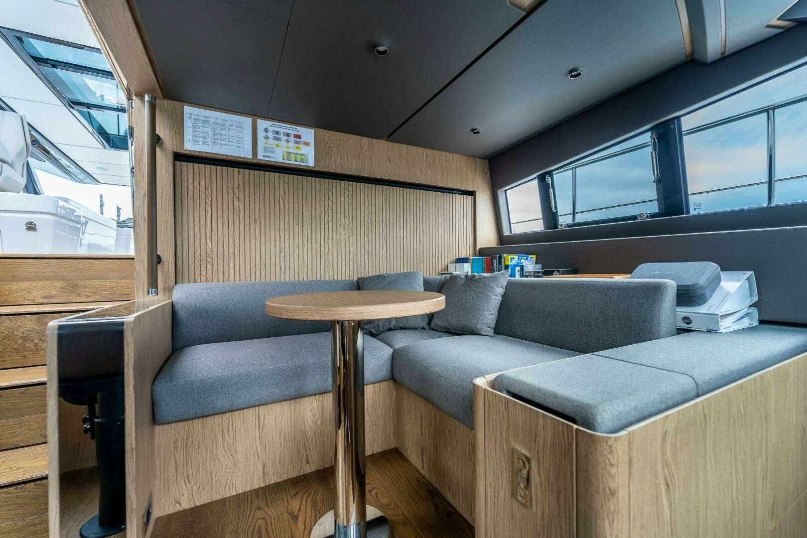 The raised pilothouse is accessed from the sliding door at the flybridge, or from the port and starboard stairways on the main aft deck. The helm station is forward on centreline with all engine controls, gauges and electronics easy to reach from the single, powered helm seat. Aft to port is a raised dinette with table in front, and there is good storage in nearby lockers.
