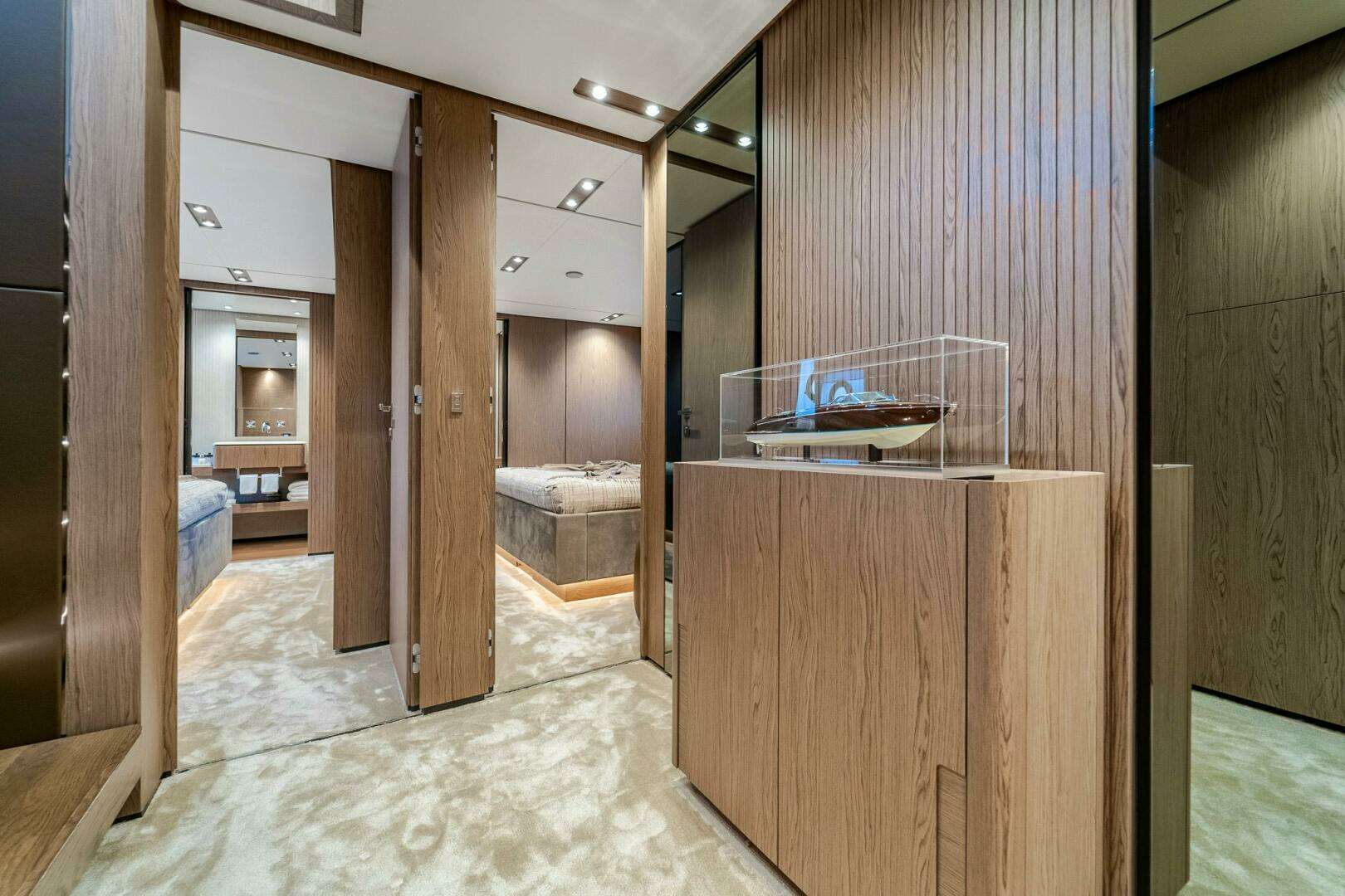 Isotta’s interior is comprised of a large open salon and dining area, with the galley, day head and master stateroom on the main deck, separated by a raised pilothouse. There are also four guest staterooms on the lower level, all have an en-suite head with shower. There are also three crew cabins with two heads and stall showers in the bow area.