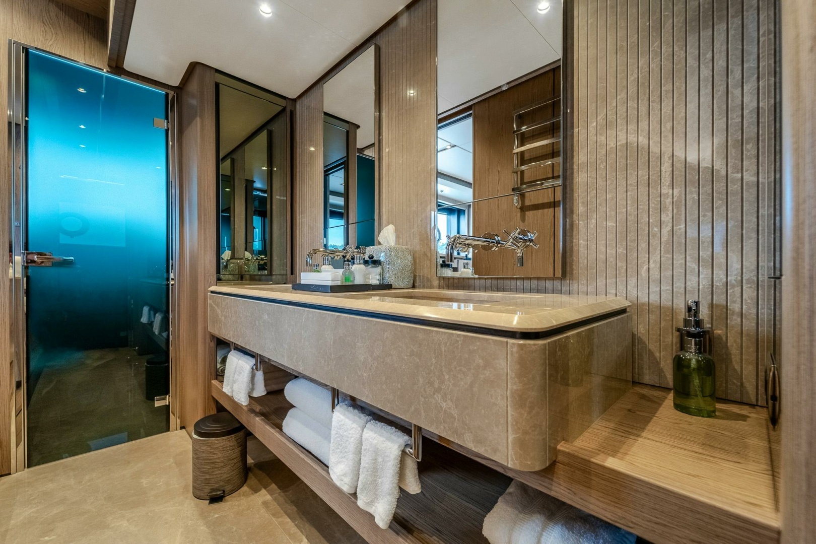 The galley is just forward to port of the dining area. All equipment is in “as new” condition. There is ample counterspace on the stone countertops and good storage in built in lockers and drawers. A powered custom partition and door allows the galley to be separated from salon/dining area when required. Forward of the galley is a large pantry area near the access to the crew area and the laundry centre, which are found below in the bow.